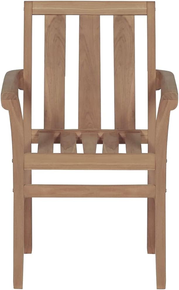 This patio wooden stackable chair set has a timeless design. The chairs will suit a wide variety of settings, such as homes, offices, bars and cafes, thanks to their simple yet stylish design.Constructed from extremely durable teak hard wood, this set of teak furniture has been seasoned, kiln dried and then fine sanded to give a very smooth appearance. Teak wood is known for its exceptional strength and weather resistance, making it far more suitable for patio furniture than any other kind of wood. Teak wood is the perfect choice if you want to purchase a long lasting piece of patio furniture. These chairs are stackable when not in use to save storage space. The product is applied with beautiful finish to give the wood a warm colour.Note: In order to extend the life of your outdoor furniture, we recommend you to clean it regularly and do not leave it outdoors without protection unnecessarily.Clean: Use a mild soap solutionStoring: If possible, store in a cool, dry place indoors. If the product is stored outdoors, protect it with a waterproof cover. Wipe and dry the excess water or snow from flat surfaces after a rain or snowfall. Allow sufficient air circulation to avoid moisture-related damage.Material: Fine sanded teak hard woodDimensions: 22.8" x 19.7" x 35" (W x D x H)Seat width: 19.3"Seat depth: 15.9"Seat height from the ground: 17.7"Armrest height from the ground: 25.2"Assembly required: YesDelivery contains:4 x Chair