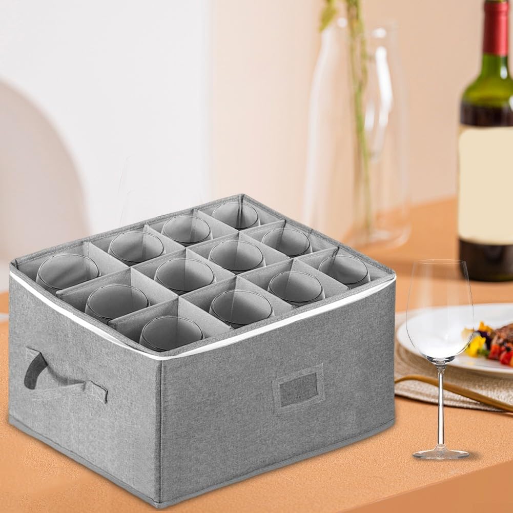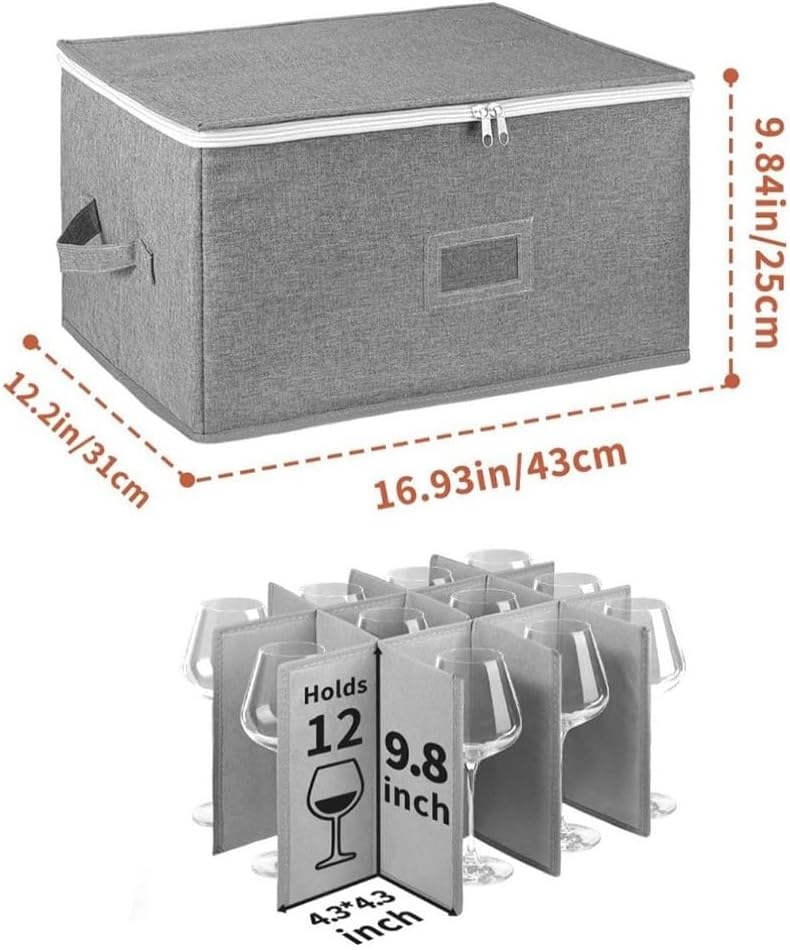 Features:*Large Capacity Design: This wine glass storage box is designed to hold up to 12 wine glasses, with dimensions of 16.9 x 12 x 9.8 inches, Guarantee ample space for your glassware collection while keeping them organized and secure. *Adjustable Dividers: Featuring 5 detachable thickened compartments, this organizer allows you to customize the layout according to the size and shape of your glasses, providing optimal protection against damage and for IMPACT during storage. *Made from high-quality polyester and reinforced with strong thick cardboard, the hard top cover provides exceptional durability and crush resistance, while soft quilted padding adds an extra layer of protection for your precious glassware. *Convenient Accessibility: The storage box is equipped with double zippers for easy access and a reinforced handle for comfortable transport, making it simple to move your glassware from one location to another without hassle. *Transparent Label Window: A built-in label window allows for easy identification of contents, helping you quickly locate specific glasses when needed, enhancing organization and efficiency in your storage solutions. Specifications:*Part Name:Wine Glass Storage Box *Material:Fabric*Size:16.9 x 12 x 9.8 inches*Color:greyPackage Content:1*Wine Glass Storage Box