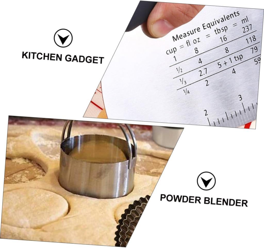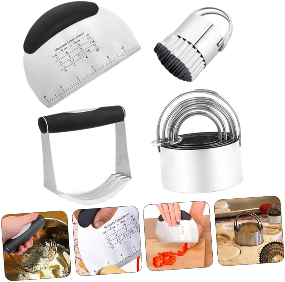 Package Include 1 x Single-side cutter 1 x powder 1 x set of 5pcs cookie cutter 1 x small size wave biscuit mold Features -Product Info:Baking Tool Set -Color: Silver baking supplies. -Material: Stainless Steel Stainless Steel Dough Chopper. -Size: About 16.00X12.00X0.80cm/6.29X4.72X0.31inch biscuit molds. - Measurements marked clearly on the surface of dough cutter powder. - The stainless steel biscuit cutters slice biscuits evenly through dough perfectly powder blender. - Stainless Steel dough scraper and powder have a non-slip handle that is ergonomically designed for you making your bake easier kitchen gadget. - No more when you baking, a good helper for your baking Pastry Scraper Cutter. - for making pizza, pastries, doughnuts, ravioli, pasta, Biscuits, etc. cookie cutters.Goods Informationkitchen gadget Help you make pizza, .dough cutter This item is a set of baking tools, which is made of quality stainless steel material, including single cutter, powder , 5pcs/set cookie cutters, small size wave shaped biscuit mold, this set can meet your needs