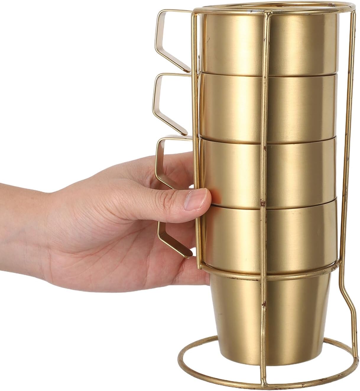 Package List 4 x Insulated Stainless Steel Coffee Cups 1 Features -Double wall safety & comfort: double insulated cups maintain ideal beverage temperature while protecting hands, making them suit as insulated camping coffee cup for and adults alike stackable latte coffee cups - Color: Golden -Product Info: Double-walled anti-scalding cup for - & unbreakable steel: these stainless steel cups are tough, built to last as insulated steel coffee cups, suitable for daily use or as stackable camping coffee mugs for outdoor fun insulated coffee mug -Fits all drink styles: whether you need a coffee mug for camping or stackable tea cups at home, this insulated coffee mugs set caters to every drink, from hot cappuccino to chilled tea stackable tea cups -Spacesaving storage system: the stainless steel mug rack efficiently stores all coffee cups with rack, helping you maintain a neat kitchen while keeping all your coffee mugs with stand close at hand camping coffee mug -Material:Stainless Steel - Size: 21.00X9.50X8.20cm/8.25X3.73X3.22inGoods Descriptionstainless steel insulated cup Enjoy both style and practicality with stainless steel coffee mugs with handle and a compact stainless steel mug rack.double wall latte cup The insulated camping coffee cup or steel coffee cups with handle are excellent for kitchens or picnic setups.coffee cup with rack These double wall latte cups double as stackable coffee mugs, allowing multiple beverage options such as tea or cappuccino and offering hygienic grip for safety