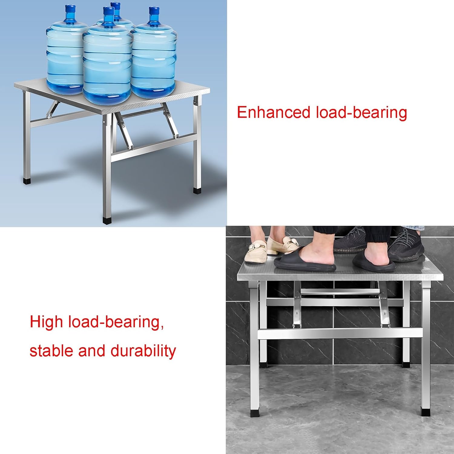 Name: Stainless steel workbench Material: Stainless steel Color: Silver Size: Multiple sizes available Suitable for: Kitchen/hotel/restaurant Assembly required: No Contents: Workbench x1 Easy to use No assembly required; simply unfold the legs to use, saving time and effort.Important notes. 1. Due to manual measurement, there may be slight differences in dimensions. 2. Due to different shooting angles or lighting conditions, there may be slight color variations. 3. Due to the use of stainless steel material, there may be slight scratches and welding marks.