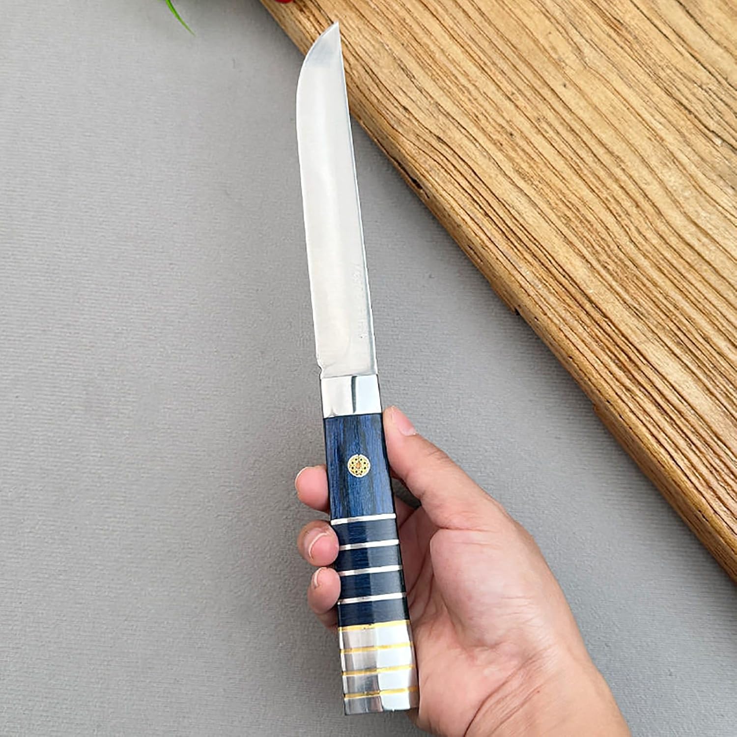 Features:1. Crafted from M390 steel, this carbon steel kitchen knife combines exceptional hardness with superior toughness. Its blade is incredibly sharp.2. The handle of this stainless steel kitchen knife is made from "Blue-Colored Wood" (Blue-Dyed Wood); ergonomically designed and smoothly polished, it offers a comfortable and secure grip.3. The fruit knife comes with a protective sheath—a thoughtful design feature that ensures safer and more convenient storage, helping to prevent accidental injury.4. The paring knife peels cleanly and precisely, making the task effortless.5. This professional kitchen knife is ideal for slicing meat, fruits, and vegetables; it can also be used to open envelopes and packages.Specifications:Product Name: Fruit KnifeBlade Material: 5CR Stainless SteelHandle Material: SandalwoodColor: BlueBlade Angle: <60°Blade Length: 14.5 cmHandle Length: 12 cmThickness: 0.25 cmPackage Contents:Fruit Knife x 1Gift Box x 1Please Note:1. Due to manual measurement, please allow for a deviation of 2–3 cm. Thank you for your understanding.2. Due to differences in monitor calibration, the color of the item shown in the photos may differ slightly from the actual product.