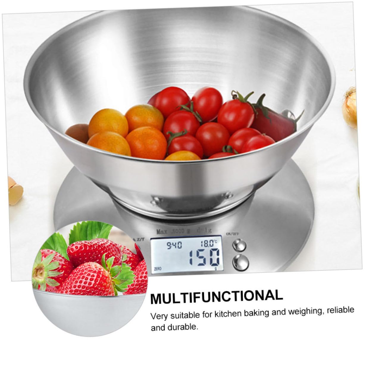 Package List 1 x Set of Scale Features -Color: Assorted Color -Power-on method: push-button Scale for Home -Unit: g/lb/oz High Precision Kitchen Scale -Size: About 21.50X14.50X6.00cm/8.45X5.70X2.36inch -Display mode: LCD blue light and black text Precise Food Scale -Weighing range: 1g-5000g Kitchen Scale -Function features: zero setting, tare, unit conversion, alarm clock, temperature measurement Multipurpose Scale -Power supply mode: 2 * AAA7 batteries Kitchen Food Scale -Function display: or overload display Electronic Scale -Weighing platform size: 100*100mm -Product Info:Kitchen scales -Material: Stainless steel -It can be used in personal homes, restaurants, shopping malls, shops, coffee shops, etc Display Scale. -Using stainless steel material, , safe and practical. -A good replacement for electronic kitchen scales is damaged or worn Kitchen Accessory. -The fashionable appearance design can bring you a good visual effect Stainless Steel Electronic Scale. -This product weighs food accurately and perfectly, which is convenient and practical High-Precision Scale.Goods InformationHigh-Precision Scale It can accurately analyze the nutritional content of food, which is perfect for baking or weight loss.High Precision Scale Suitable for professional and personal use.Food Scale This product is a food scale, made of stainless steel material, and