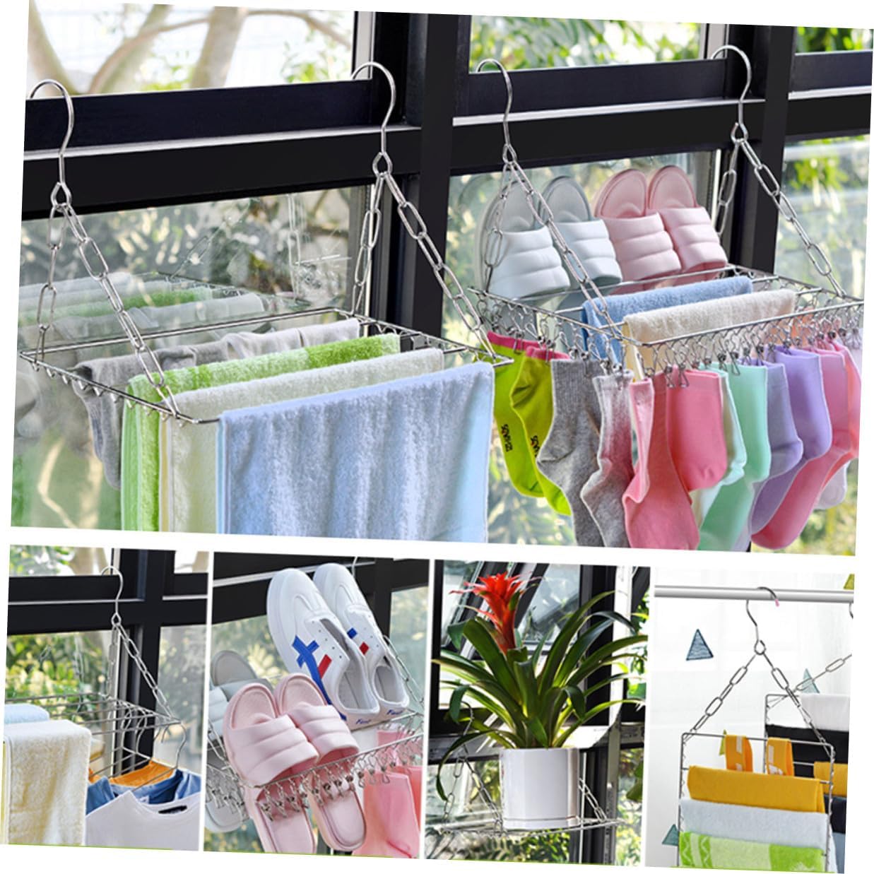 Package Include 1 x Drying Rack Features - Color: Silver. - Material: Stainless steel. -Product Info:Balcony sock drying rack - A variety of hanging methods can be adjusted at will pant hanger. - The movable buckle can be adjusted according to the need, so that the object surface is stable clothes drying rack heavy duty. - Stainless steel frame forming in one body, high elasticity and easy to pinch pants hangers. - With this item, it can bring much convenience in your life clothing racks for drying clothes. - Thickened solid stainless steel, solid welding, no deformation clothes hanging rack. - Multi-functional shelving, can store pants, towels, shoes, potted plants and other items, hanging at will multi-functional drying rod.Goods Descriptiondrying racks Are you looking for a professional, yet drying rack? Are you in search of a sturdy, trustworthy drying rack that can do multiple jobs at once? , ! Our professional drying rack must meet your need.clothes hanging is the for you