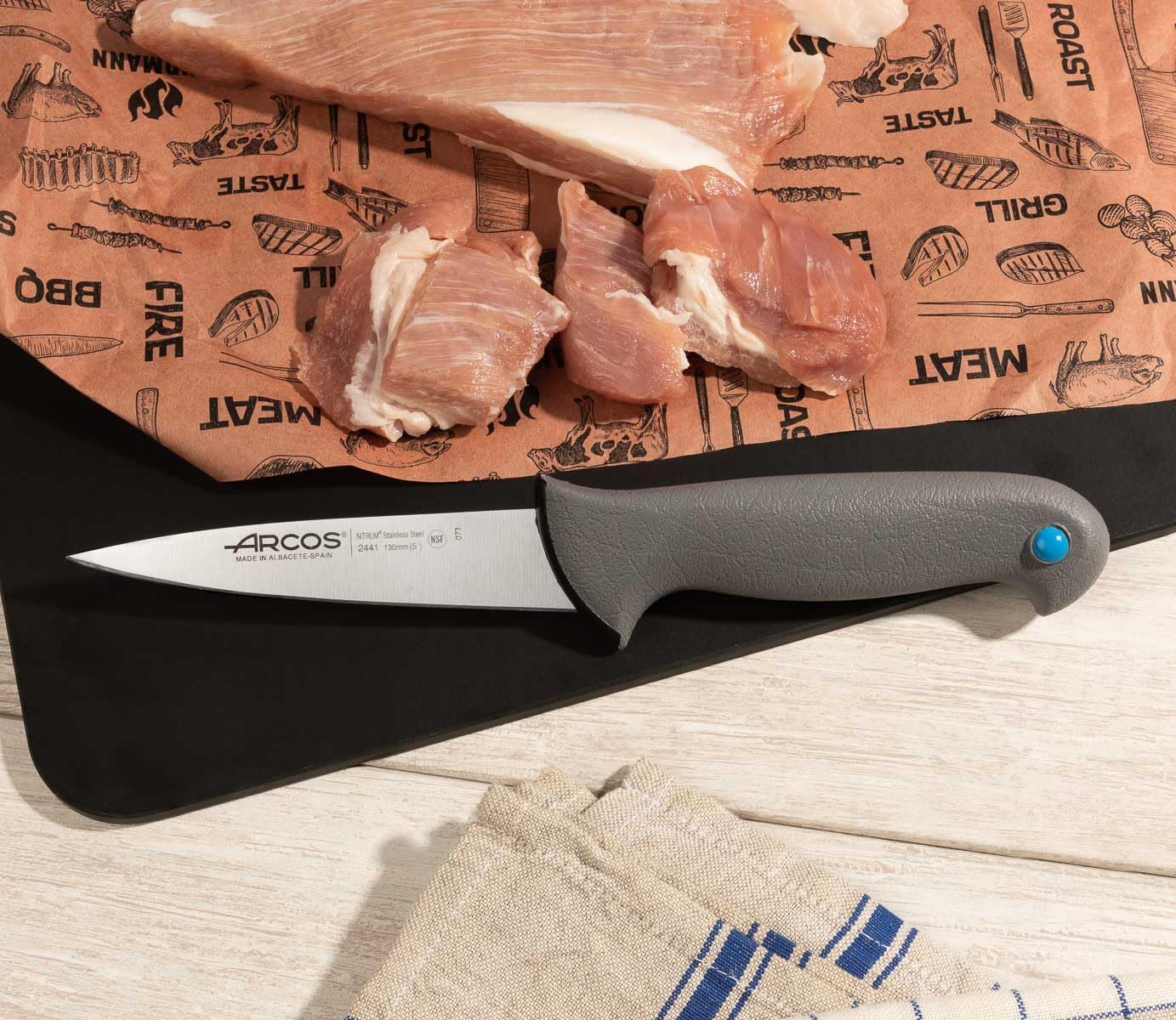Butcher knife Arcos Colour - Prof 244100 stainless steel Nitrum and ergonomic Polypropylene handle and 13 cm (5.12") blade, sheath display Ergonomically designed knife designed for prolonged use Product Description: Arcos Colour Prof - Butcher Knife 13 cm (5.12") Specially designed for prolonged use. Exclusive high performance and durable stainless steel NITRUM. The handle used in this series is a revolutionary ergonomic handle, composed of: a hard core of Polypropylene (PP) in the heart of the handle and a special soft rubber coating. This mixture of materials provides great comfort and adaptability in use, in addition to being a non-hygroscopic material (does not absorb liquids), resistant to high temperatures and non-slip. Color identifiers: Each knife can be identified according to the food to be cut, through the use of colored polypropylene caps, thus achieving a better hygienic-sanitary control for the consumer, based on European regulations. Yellow: Cooked food Red: Meat Blue: Fish Green: Vegetables and fruits Brown: Vegetables White: Pastry and dairySPECIFICATIONSStainless steel bladeHandle made of elastomer-coated polypropyleneDisplay case