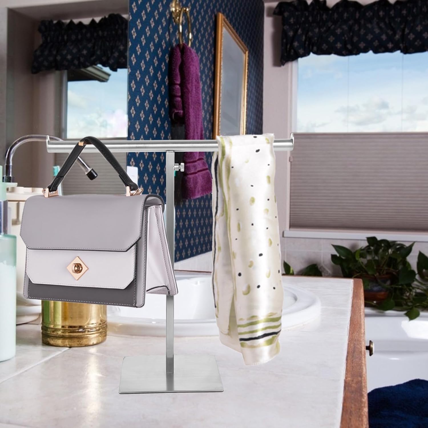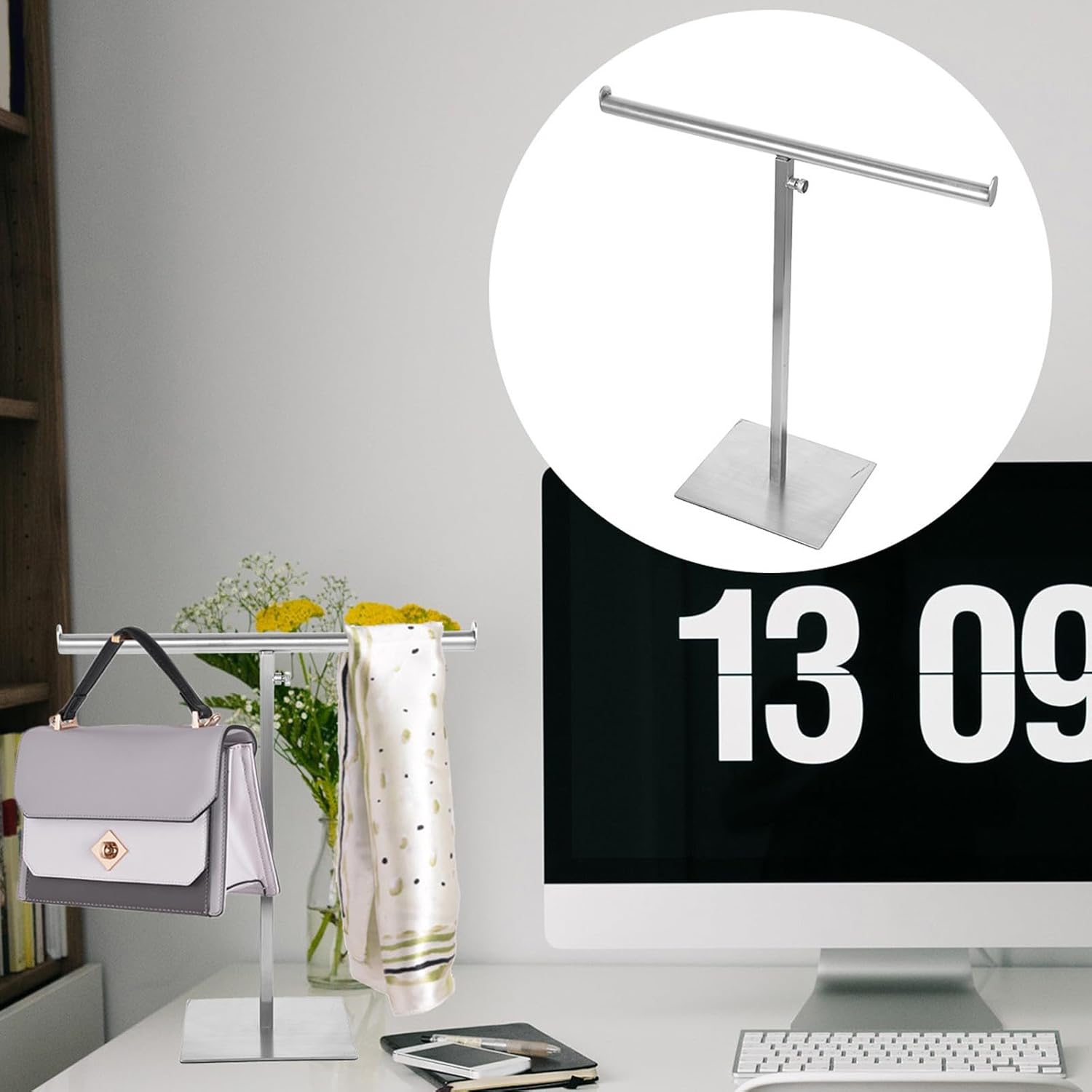 Package List 1 x handbag display stand Features - Size: About 57.00X34.00X15.00cm/22.40X13.36X5.89in -Product Info:Stainless steel hanger - Material: Stainless steel - Color: Silver - The purse hanger has a strong load bearing ability, a good tool for displaying and storing your bag handbag display holder. - The adjustable design to save storage space. Simple to use, easy to take, suitable for home or store use Handbag Rack. - The smooth edges will not scratch your bags or belt, and your hands, giving you great convenience t-shaped purse display stand. - Owning the strong wear and break resistance ability, very practical, with excellent texture Bag Holder Rack. - Designed for hanging bags, the reasonable design protects your bag from and wear retail purse display stand.Goods Informationpurse display rack You can put some items on it, such as towels, bag, etc.bags display rack Perfect for home and mall use.Bag Hanging Rack This bag hanger is made of stainless steel material, practical for lasting use.Handbag Hanging Rack This hanger allows you to see the beautiful display of your handbag as you collect it