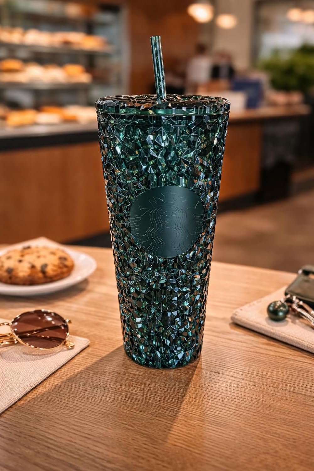 Add a touch of brilliance to your daily coffee routine with the Starbucks Deep Emerald Gemstone Cold Cup 24 oz. Inspired by the sparkle of cut gemstones, this tumbler features a unique faceted texture that catches the light and creates a bold, sophisticated look. The rich emerald green color paired with the iconic Starbucks siren logo gives the cup a premium, collectible feel that Starbucks fans will love. Designed for cold beverages, this reusable tumbler holds 24 ounces, making it ideal for iced coffee, cold brew, tea, refreshers, smoothies, and more. The durable BPA-free acrylic construction offers both style and functionality while helping reduce single-use plastic waste. The cup includes a secure lid and reusable straw, making it easy to sip your favorite drinks whether you're at home, commuting, working, or relaxing. The textured exterior also provides a comfortable grip while enhancing the tumbler’s striking appearance. Perfect for coffee lovers, Starbucks collectors, students, and office workers, this stylish cold cup makes a great gift for birthdays, holidays, or anyone who enjoys Starbucks-inspired drinkware. Elevate your drinkware collection with this elegant and reusable Starbucks tumbler designed to stand out.