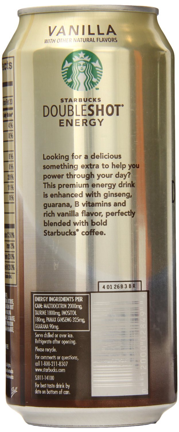 Indulge yourself and stay energized with Starbucks double shot energy vanilla. It's a powerful mix of espresso and B vitamins, guarana and ginseng to which is added vanilla and low fat cream to give this drink a delicious finish.