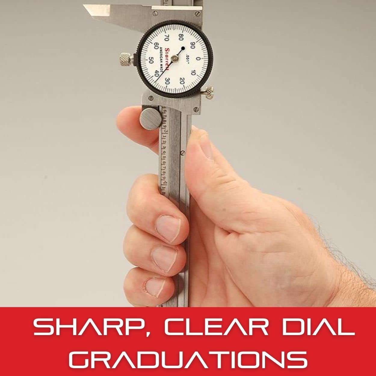 Product Description The Starrett dial caliper has sharp black graduations every 0.100" on the no-glare, satin-finished stainless steel bar, and graduations on the dial every 0.001". One full revolution of the dial is equivalent to 0.100". These calipers have knife-edge contacts for measuring both inside dimensions (ID) and outside dimensions (OD). The knife-edge contacts can be used to scribe parallel lines on the workpiece. This caliper can be used with one hand through operating the fine adjustment roll with the thumb. The lock screw locks the dial bezel and holds the sliding jaw in position. The depth rod is integrated into the rack of the caliper, unlike many calipers which offer a detachable depth rod, or none at all.The hardened stainless steel components, including the bar, measuring surfaces, rack, gears, and depth rod, offer corrosion resistance, increased accuracy, and long life. Positive split gear anti-backlash control offers increased accuracy over standard gear configurations. Backlash is the amount of clearance between mated gear teeth in the caliper controls, which prevents the gear teeth from jamming. It is undesirable to have much backlash due to the lack of precision offered by the increased amount of play between gears. Certain gear designs can minimize or eliminate backlash; split gear systems actually split the gear into two gears, each half as thick as the original gear. One of these gears is then fixed to the shaft while the other gear is allowed to turn. The free-turning gear is connected to coil springs that rotate it until all of the backlash in the control system has been eliminated. The rack teeth point down to keep foreign matter from clogging the gear operations. This prevents measurement errors where metal chips could interfere with proper caliper operation.Calipers measure the distance between two opposing sides of an object. They make inside, outside, depth, or step measurements, according to their type. Calipers are commonly used in architecture, metalworking, mechanical engineering, and machining. The simplest calipers have two legs to mark the two points and require a ruler to take the measurement. More complex calipers use two sets of jaws instead of legs and have up to two graduated scales. Vernier, dial, and digital calipers give direct and accurate readings and are functionally identical, having a calibrated scale with a fixed jaw, and another jaw with a movable pointer that slides along the scale. The vernier caliper has a scale sliding parallel to the main scale for an additional, fractional reading to improve measurement precision. The dial caliper has a circular dial with a pointer on a toothed gear rack replacing the second vernier scale. As with the vernier, this second measurement is added to the reading from the main scale to obtain the result. The digital caliper takes a differential by zeroing the display at any point along the slide, with an LCD that displays a single value in English and/or metric units. The L.S. Starrett Company manufactures precision measuring tools, metrology and testing equipment, and saw blade products. The company was founded in 1880 and is headquartered in Athol, MA. From the Manufacturer The only American Made Dial Caliper, this is one of the handiest measuring tool available. Used by mechanics and toolmakers everywhere, it direct reading and accurate.