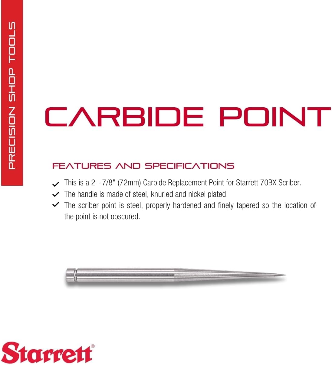 This is a 2-3/8" (60mm) Carbide Replacement for Starrett 70AX Scriber. Overview of the Scriber: The handle is made of steel, knurled and nickel plated. The scriber is steel, properly hardened and finely tapered so the location of the is not obscured. The scriber is held firmly in the handle by a knurled chuck and when not in use can be reversed, telescoped into the handle, and locked by the chuck. The hexagon-shaped head prevents rolling. Starrett tools are designed to be user-friendly. Whether you're an experienced professional or an amateur when it comes to home improvement, our tools are handy and accessible. Starrett has set the standard for precision, quality, and innovation. Our products are long-lasting and robust with excellent service and performance. Manufacturing long-lasting and easy to use tools that provide consistent and reliable performance since 1880, Starrett tools are made with the highest standard of quality and workmanship, manufacturing more than 5,000 various tools, gages, and instruments, providing fine precision tools for industrial, professional, and consumer markets worldwide.