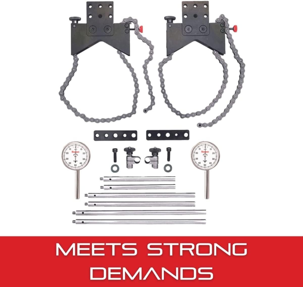 The Starrett S668CZ shaft alignment clamp set includes two chain clamps, two 196B5 back-plunger dial indicator gauges, two PT18724 snugs, two extension plates, and various posts to perform radial and angular alignment of motors, pumps, and compressors. The portable set comes in a fitted, convenient case for organization and storage. The clamp set provides a pair of indicator gauges to measure alignment distortion, with a configurable armature to secure the gauges in position on two axes. The two chain clamps consist of a black anodized aluminum frame with a roller chain that can secure the clamp around a shaft up to 7.5 inches in diameter. The three pairs of 3/8-inch diameter posts measure to 5", 7-7/16", and 9" in length, and are made of stainless steel for rigidity. Two extension plates provide additional radial clearance when needed. Two stainless steel snugs secure one post to another, to hold the gauges in measuring position. The two 196B5 back-plunger dial indicator gauges have three contact points and are graduated to 0.001", with a travel range to 0.2" The gauges have a 0.25" shank, a white dial face with numbers ascending from 0 to 50 and descending back to 0, and a rotating knurled bezel to set the dial pointer to the zero position. Clamps are fastening tools that use pressure to secure workpieces to each other or to a workspace and prevent movement. Clamp style varies widely, depending on general and specialized applications. Many clamps are for temporary use during construction, repair, or alignment of a workpiece, while others may be used to secure a component in its final installation or assembly. The L.S. Starrett Company manufactures precision measuring tools, metrology and testing equipment, and saw blade products. The company was founded in 1880 and is headquartered in Athol, MA.