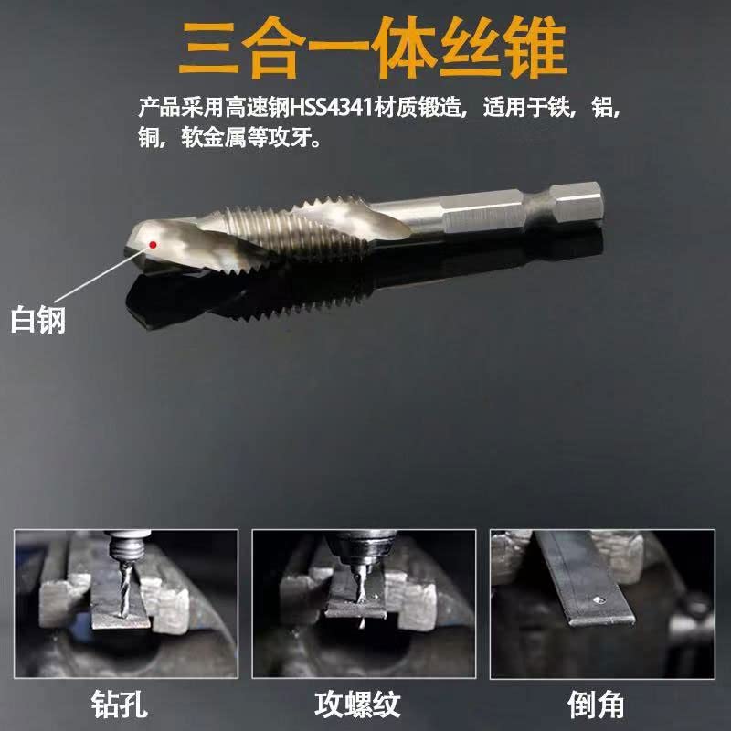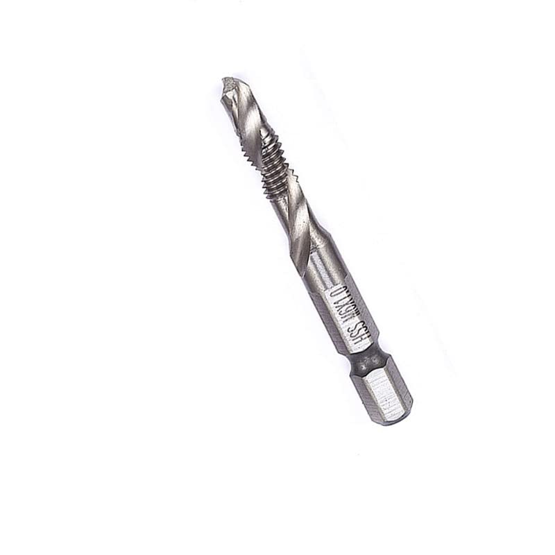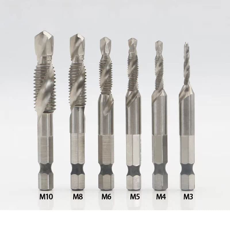 The product is forged with high-speed steel .Tapping and drilling integrated structure, HSS material, significantly improve durability and cutting performance.3-in-1 composite tap, stainless steel special / opening, tapping, chamfering.Hole tapping is completed in step, shortening time and improving work efficiency.Suitable for tapping iron, aluminum, copper, soft metals, etc.Specifications:Name: Hex handle compound Tap Drill BitsMetric : M3x0.5, M4x0.7, M5x0.8, M6x1, M8x1.25, M10x1.5.Material: High-speed steel(HSS )Size:M3x0.5: Total length: 55mm, Spiral length: 24mm, drill diameter: 2.5mmM4x0.7: Total length: 54mm, Spiral length: 24mm, drill diameter: 3.3mmM5x0.8: Total length: 58mm, Spiral length: 28mm, drill diameter: 4.2mmM6x1: Total length: 58mm, Spiral length: 28mm, drill diameter: 5.0mmM8x1.25: Total length: 59mm, Spiral length: 18mm, drill diameter: 6.8mmM10x1.5: Total length: 59mm, Spiral length: 20mm, drill diameter:8.5mmSquare handle: 6.35mmPackage include:1 x M 3 Hexagon handle compound Tap Drill Bits1 x M 4 Hexagon handle compound Tap Drill Bits1 x M 5 Hexagon handle compound Tap Drill Bits1 x M 6 Hexagon handle compound Tap Drill Bits1 x M 8 Hexagon handle compound Tap Drill Bits1 x M 10 Hexagon handle compound Tap Drill Bits(Notice: Manual measurement may be a little error please understand!)No need for shaking or reducing friction, capable of withstanding heavy-load operations, making the cutting process smoother