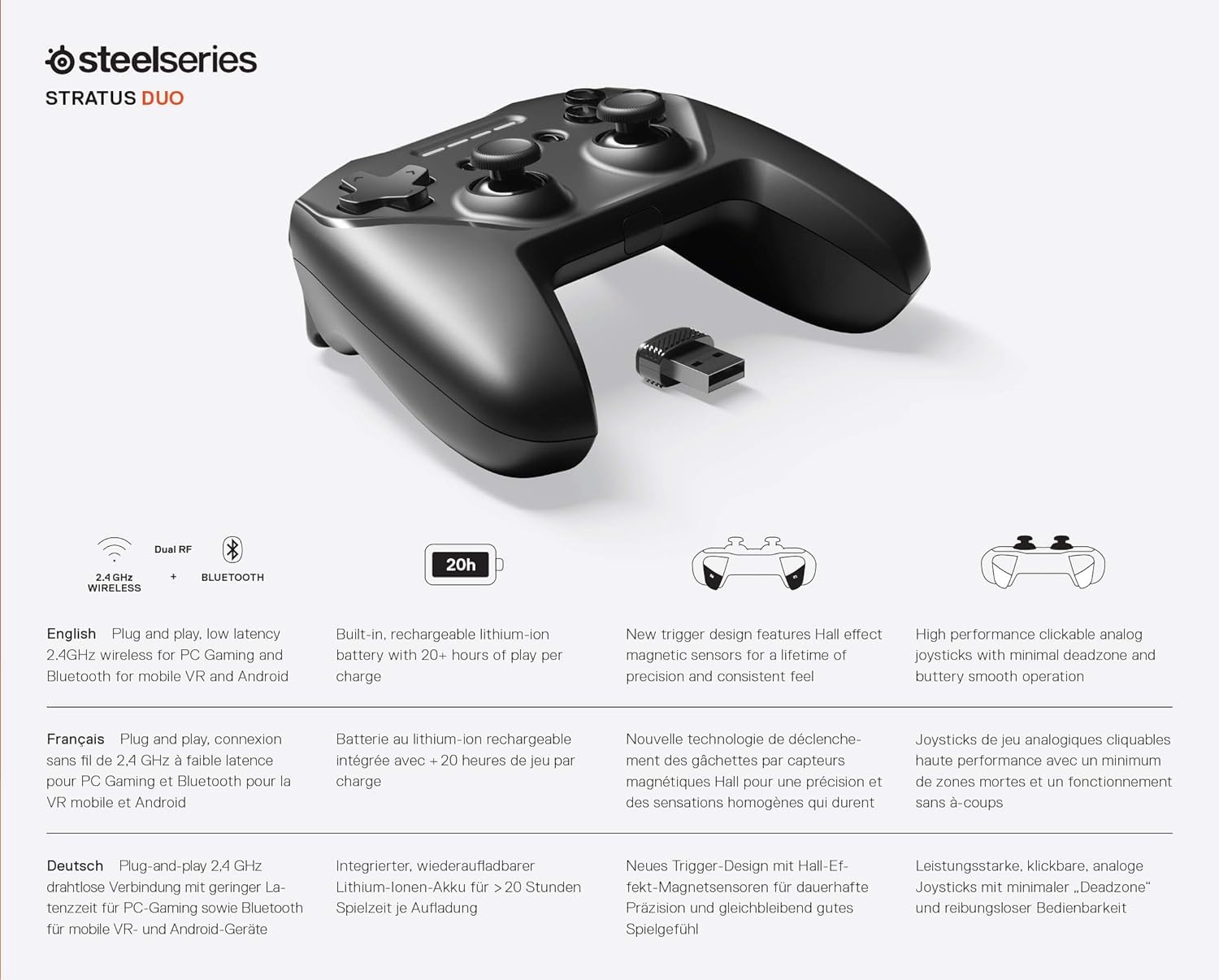 The Stratus Duo brings a true wireless console gaming experience to Android, Windows, Chromebook, VR, and more. Use Bluetooth for setup-free gaming on Android mobile devices, or swap to 2.4GHz wireless to play on Windows and 5, 000+ controller-enabled games on steam. Stratus duo's high-performance joysticks and triggers register inputs faster and more accurately than touchscreens and standard controllers. A rechargeable lithium ion battery provides 20+ hours of battery life, so you can easily play wherever you go. Compatible with PC (Windows 11/10/7), Steam, VR (Oculus Rift, Oculus Go, Samsung Gear VR), Android 3.1+, ChromeOS