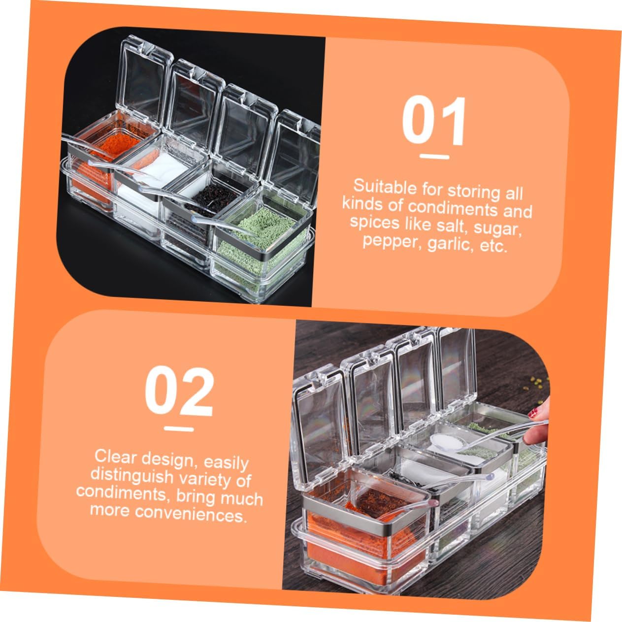 Package List 4 x Seasoning Boxes 4 x Spoons 1 x Organizing Tray Characteristics - Size: 25.00X9.50X6.20cm/9.82X3.73X2.44in salt jar -Color: Transparent spice jars -Material: Acrylic, stainless steel seasoning containers - Suitable for storing all kinds of condiments and spices like salt, sugar, pepper, garlic, etc spice jar. - A housewarming your friendly or family, show them your love and concern seasoning jars. - Not easy to break, long serving life Washable, easy to clean and dry, convenient for use condiment containers with lids. - Designed with lid, , and the tray included allow you to easily store and organize them in an orderly way spice box. - Clear design, easily distinguish variety of condiments, bring much more conveniences sugar container.Goods Informationcondiment containers with lids It is and sturdy for use.sugar container Fine workmanship practicality and durability.seasoning jars Are you looking for a professional and spice box or seasoning jar for kitchen? , ! Our product must meet you needs
