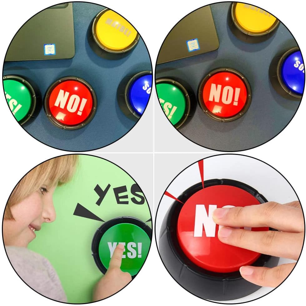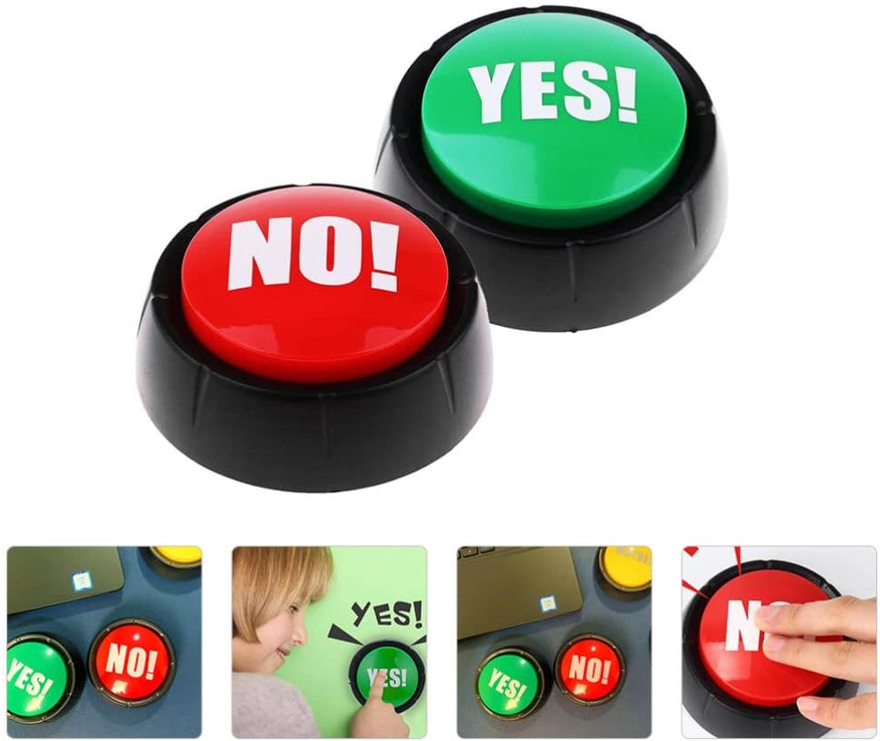 2Pcs Yes Button and No Button with Sound, Dog Buttons for Communication Answer Buzzers Set Dog Talking Button Set Noise Button ToysFeaturesColor: Red, green;Material: Plastic.;Size: About 9.00X9.00X4.00cm/ 3.54X3.54X1.57inch;Note tips: 2 x AAA batteries needed to install ( battery not included );Four- piece Yes No. Buttons are made of premium plastic. material, lightweight and durable, supporting you to use for a long time; Each of them is approximate 3.54 x 3.54 x 1.57 inches.You will receive 4 pieces of buttons with sound, and they' re printed respectively with the word "Yes!" in green, and "No.!" in red.Dog buttons for communication are powered 2 AAA batteries ( batteries not included ), installing the batteries after, simply press to make sounds.Dog communication buttons could be used for training pets. Bring some joy to your home with these lovely noise buttons, they can be used for games at home, school, or pet training.It' s a different way to say "yes" "no.!". Playing your favorite games with no. buttons will become much more interesting and fun.Package Including4 x Playthings