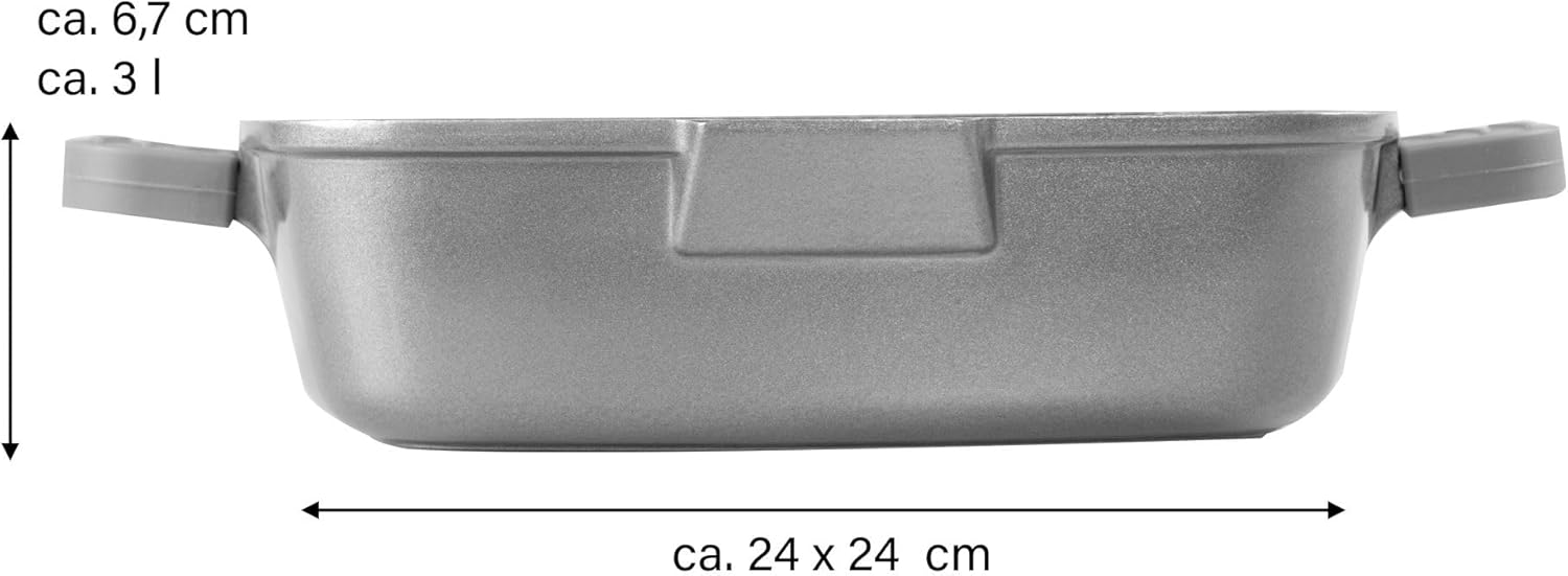 STONELINE square pan with sieving glass lid; dimensions: 24 x 24 cm; height: 6.7 cm; capacity: approx. 2.9 L; 2 silicone oven mitts Material: cast aluminium, lid with Bakelite handles, sieving glass lid made of heat-resistant glass Original Stoneline non-stick coating with real stone particles Easy to clean: rinse with hot water, dry and it's ready (dishwasher-safe) Can be used on induction, gas, electric, glass-ceramic and halogen hobs (suitable for all hob types)