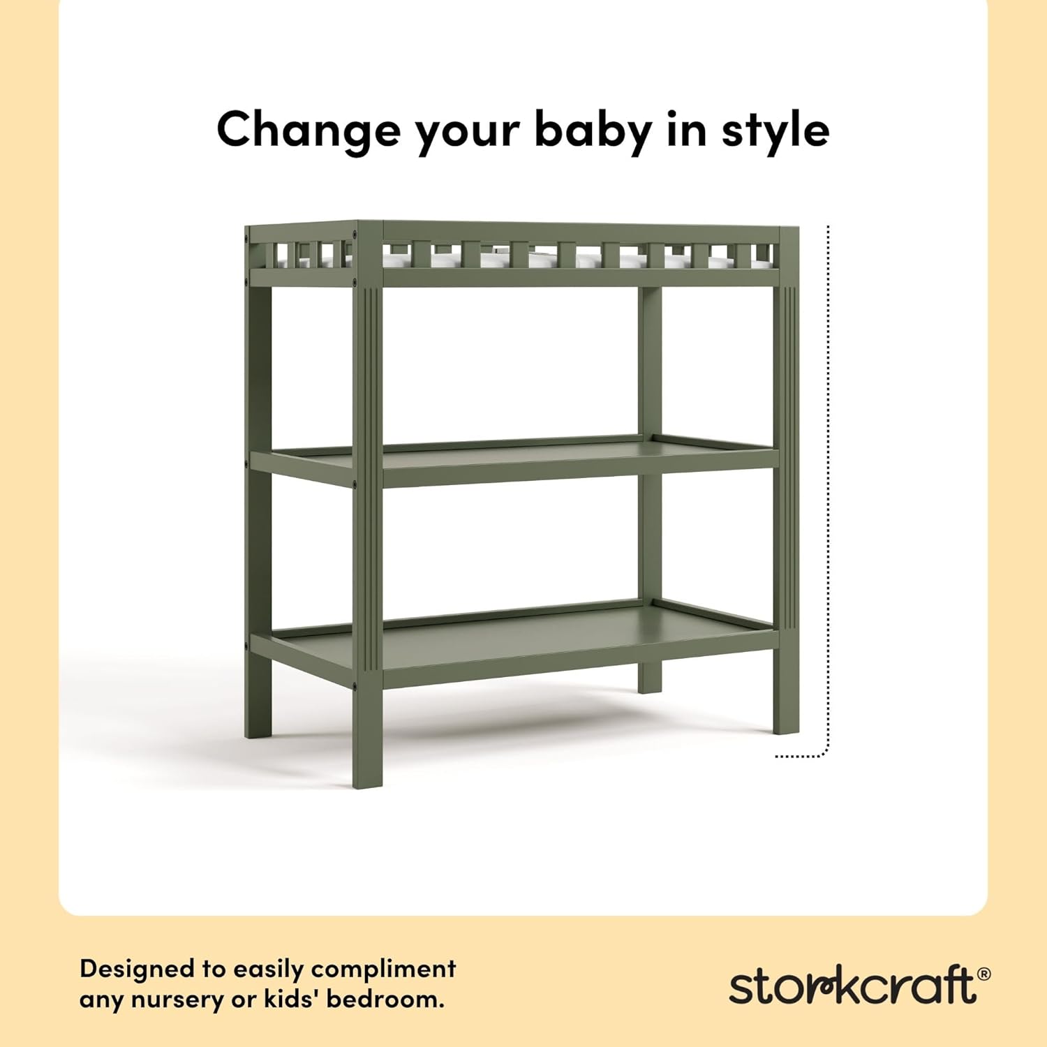 Stylish and simple. Elegant and minimalist. Introducing the timeless, easy-to-match, and easy-to-assemble Storkcraft Morningside Changing Table — a quality crafted baby changing table from Storkcraft, North America’s longest-standing name in baby cribs (since 1945). The Morningside is crafted of solid New Zealand pine wood and wood composites, and is GREENGUARD Gold Certified — Furniture with GREENGUARD Gold certification has been screened for over 10,000 chemicals and volatile organic compounds (VOCs) and meets or exceeds strict chemical safety standards. In addition, the Morningside is certified by the Juvenile Products Manufacturers Association (JPMA) — JPMA Certified products are expert tested by third-party, accredited laboratories to meet or exceed all applicable category voluntary and mandatory safety standards. The Morningside’s applied finish is tested to meet or exceed applicable ASTM and CPSIA safety standards. Designed to provide you with a convenient and secure place to change your baby's diaper, the Storkcraft Morningside Changing Table includes a waterproof diaper changing pad, "click shut" safety strap, and two (2) open shelves for additional nursery storage. Storkcraft has been recognized with industry awards from the likes of Fast Company, Parents, Baby Innovation Awards, and more, and is the proud recipient of the Parent Tested Parent Approved (PTPA) Seal of Approval for nursery and children’s bedroom furniture. The Morningside is backed by Storkcraft’s supportive, real-life Customer Care team and 1-year limited manufacturer’s warranty. Easy, 30-minute (or less) assembly required (two people recommended for assembly). Waterproof baby changing pad included. Complete Storkcraft’s Morningside Collection with the matching Storkcraft Morningside 5-in-1 Convertible Crib.
