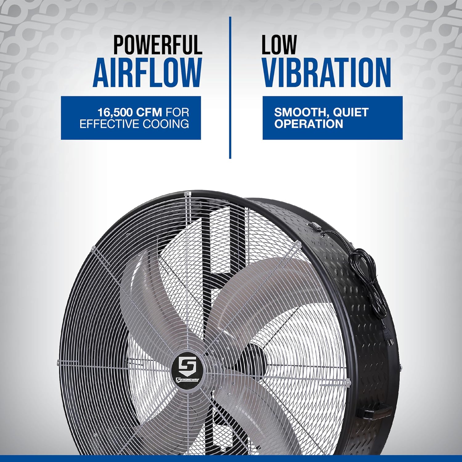 The Strongway 42in. Direct Drive Drum Fan delivers powerful high-velocity airflow for cooling warehouses, garages, workshops and industrial spaces. Producing up to 16,500 CFM, this heavy-duty drum fan moves large volumes of air to improve circulation and ventilation in demanding environments. Powered by a rugged 120V, 3/5 HP direct drive motor, it supports reliable low-vibration operation with reduced maintenance. An all-steel barrel construction, mobility-focused frame and long 9.5ft. power cord make the Strongway 42in. Direct Drive Drum Fan a dependable solution for industrial cooling applications.