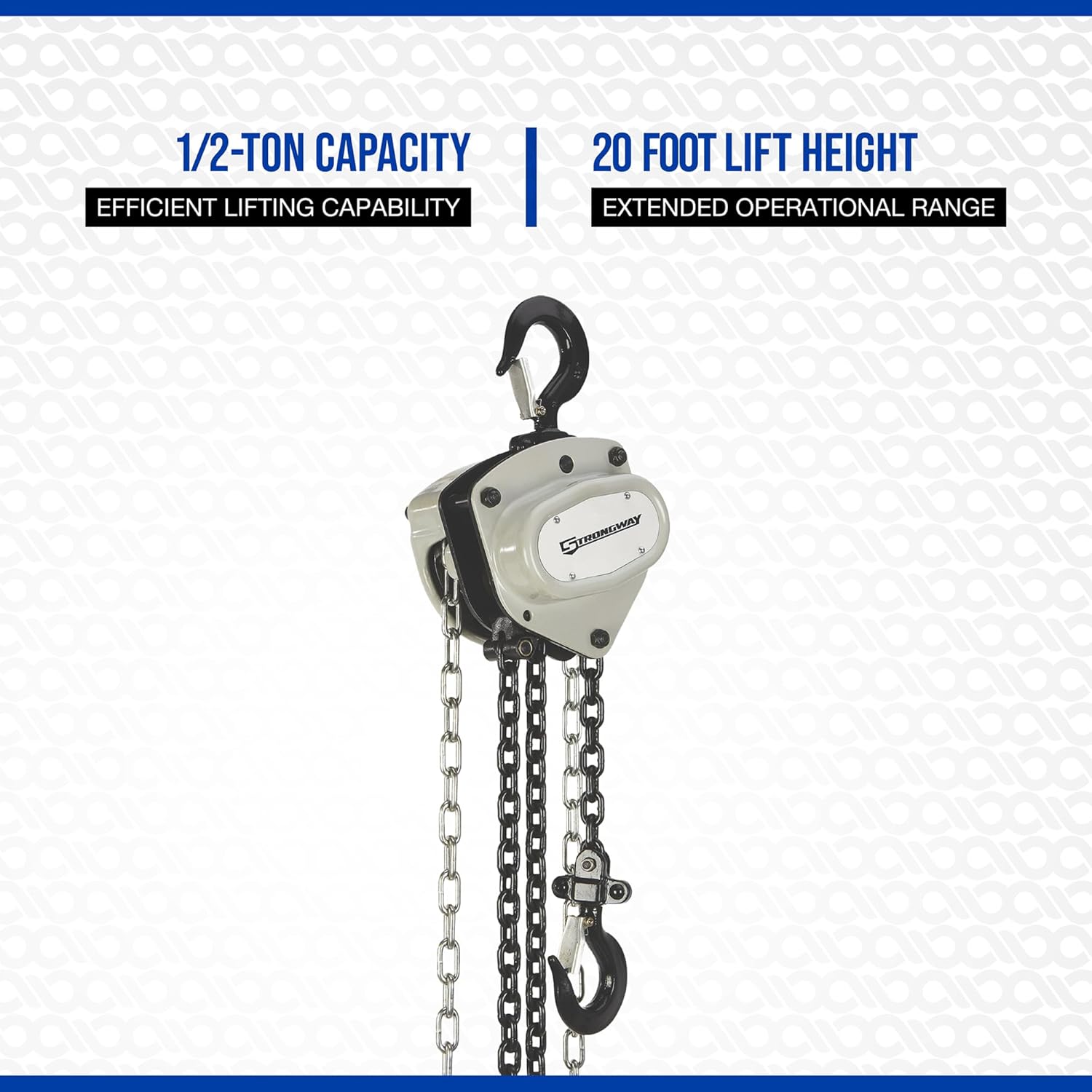 This Strongway Manual Chain Hoist is a commercial-grade hoist with heat-treated double pawls to ensure good spring and reliable brakes. This unit meets ASME B30.16/ASME HST-2:2014 safety standards and features a durable high-strength steel frame and gear case, a Grade 80 load chain and lithium grease to deliver solid performance. The tough ductile drop-forged hooks ensure noticeable opening when subject to excessive overload. The caged roller bearing, zinc-plated side plate, hand chain with rolled-edge design and asbestos-free friction disc combine for smooth operation. The cast steel safety latch on the 360° swivel hook increases safety.