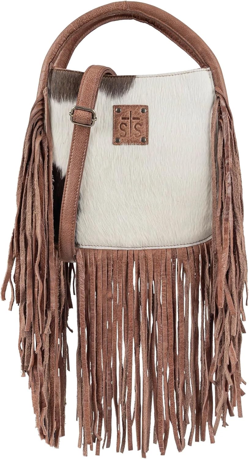 STS Ranchwear Genuine hair-on-hideFull grain milled and tumbled buffalo leather accentsZip top closureDual rolled leather carry handlesRemovable and adjustable leather crossbody strap1 exterior slip pocket1 interior main compartment1 interior zip closure pocket1 interior slip pocketFringe accentsDimensions: 8" W (top) x 8.5" H STS35271 Elevate your everyday style with the Indie Cowhide Sugar Satchel from STS Ranchwear. Crafted from genuine hair-on-hide with full-grain milled and tumbled buffalo leather accents, this satchel features a zip top closure, dual rolled leather handles, and a removable adjustable crossbody strap for versatile carrying. Stay organized with an exterior slip pocket, a main interior compartment, an interior zip pocket, and an additional slip pocket. Finished with fringe accents, the Sugar Satchel offers practical functionality with a touch of Western flair.
