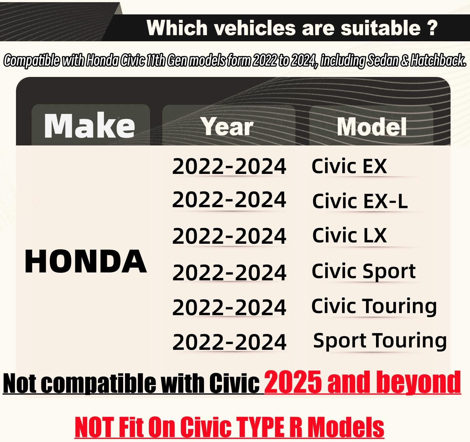 | Compatible with Vehicle Type | Civic Hatchback, Civic Hybrid, EX, EX-L, Honda Civic Sedan, Sport, Sport Touring, Touring |