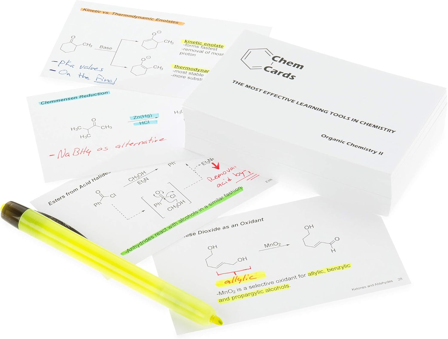 Using ChemCards will demystify organic chemistry, making it easier for you to learn. The ChemCards Semester 2 set, printed on 3x5 premium card stock, includes 114 cards that summarize naming, reactions, and mechanisms in simple clarity. A highly-effective variation of the proven "flashcard" method of study, ChemCards drive straight into the key concepts, removing the complexity students often encounter in lectures and textbooks. We've learned that once you understand the fundamentals, the details and special cases fall right into place. We don't crowd our cards with lists, bullet points and commentary. ChemCards show you what matters. If you want to add notes or points you're having trouble remembering, add those to the cards to create the ultimate study toolkit. Join the growing group of students who are learning faster, studying more effectively, and conquering organic chemistry.