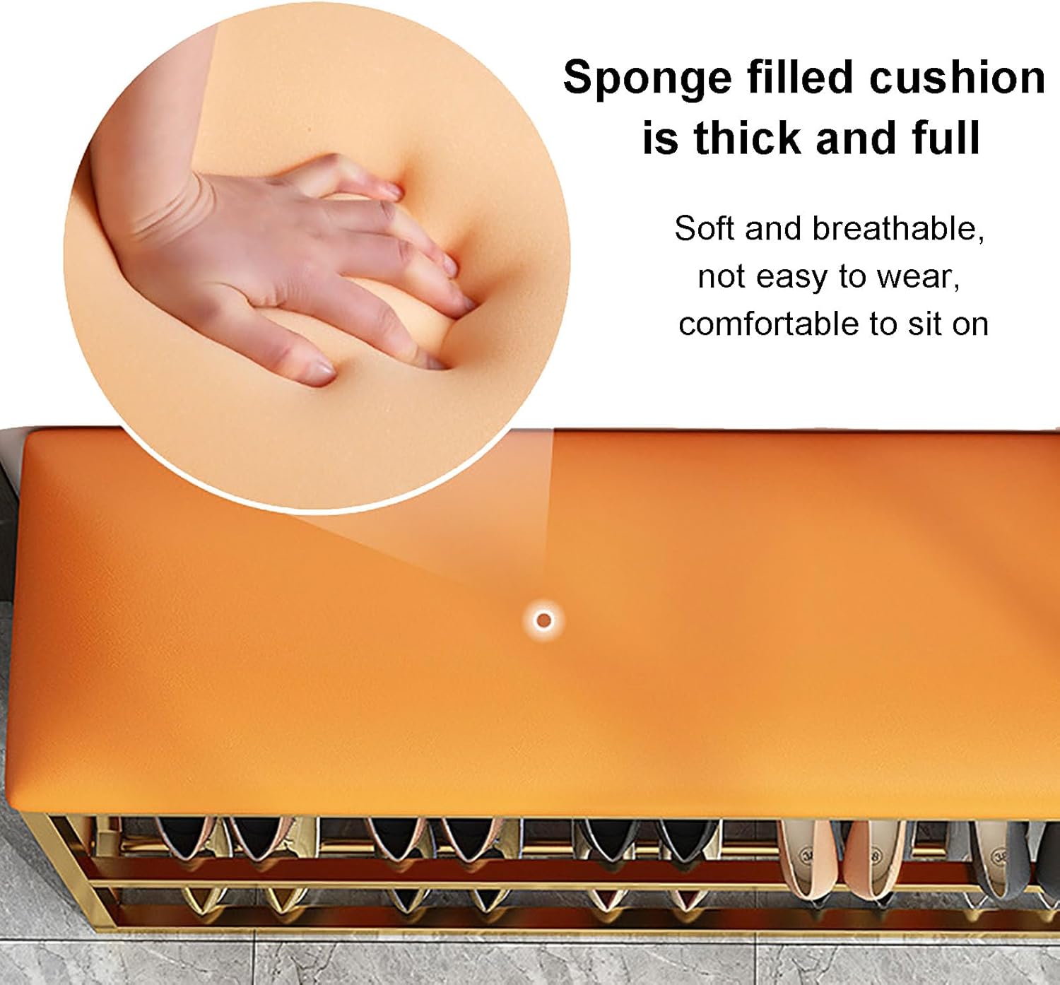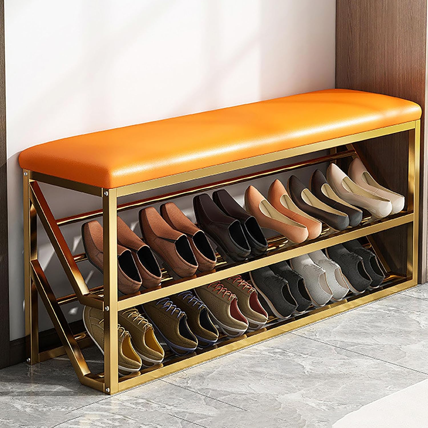 Boot Storage Organizer:Transform your entryway into a stylish and organized space with our versatile Shoe Storage Bench. This thoughtfully designed piece not only provides a comfortable seating area for you to put on or take off your shoes but also helps keep your footwear neatly arranged, eliminating clutter and creating a welcoming atmosphere. **Functional and Chic Design** Our Shoe Bench is perfect for any entryway, allowing you to effortlessly manage your shoe collection while adding a touch of elegance to your home decor. The sleek design complements various styles, making it a great addition to your hallway, living room, or even your patio. **Comfortable Upholstered Top** Experience the luxury of our padded top, upholstered in high-quality PU leather. This feature ensures that you can sit comfortably while dressing, enhancing your daily routine with a touch of sophistication. **Elegance Meets Durability** Crafted with intricate quilting techniques and high-bounce sponge padding, our bench not only looks great but is also built to last. The combination of metal and leather materials ensures that it withstands daily use while maintaining its stylish appearance. **Versatile Usage** This shoe storage solution is not just limited to the entryway. Use it in your corridor, kitchen, or even as a decorative bed-end bench in your bedroom. Its adaptability makes it a practical piece for any room in your home. **Specifications:** - Product Name: Shoe Bench - Material: Metal, PU Leather, Sponge - Assembly Required: Yes - Purpose: Shoe storage and seating **Package Includes:** - 1 Shoe Bench - 1 Accessory Kit - 1 Instruction Manual Elevate your space with our Shoe Storage Bench, where style meets utility, and enjoy a clutter-free lifestyle today.