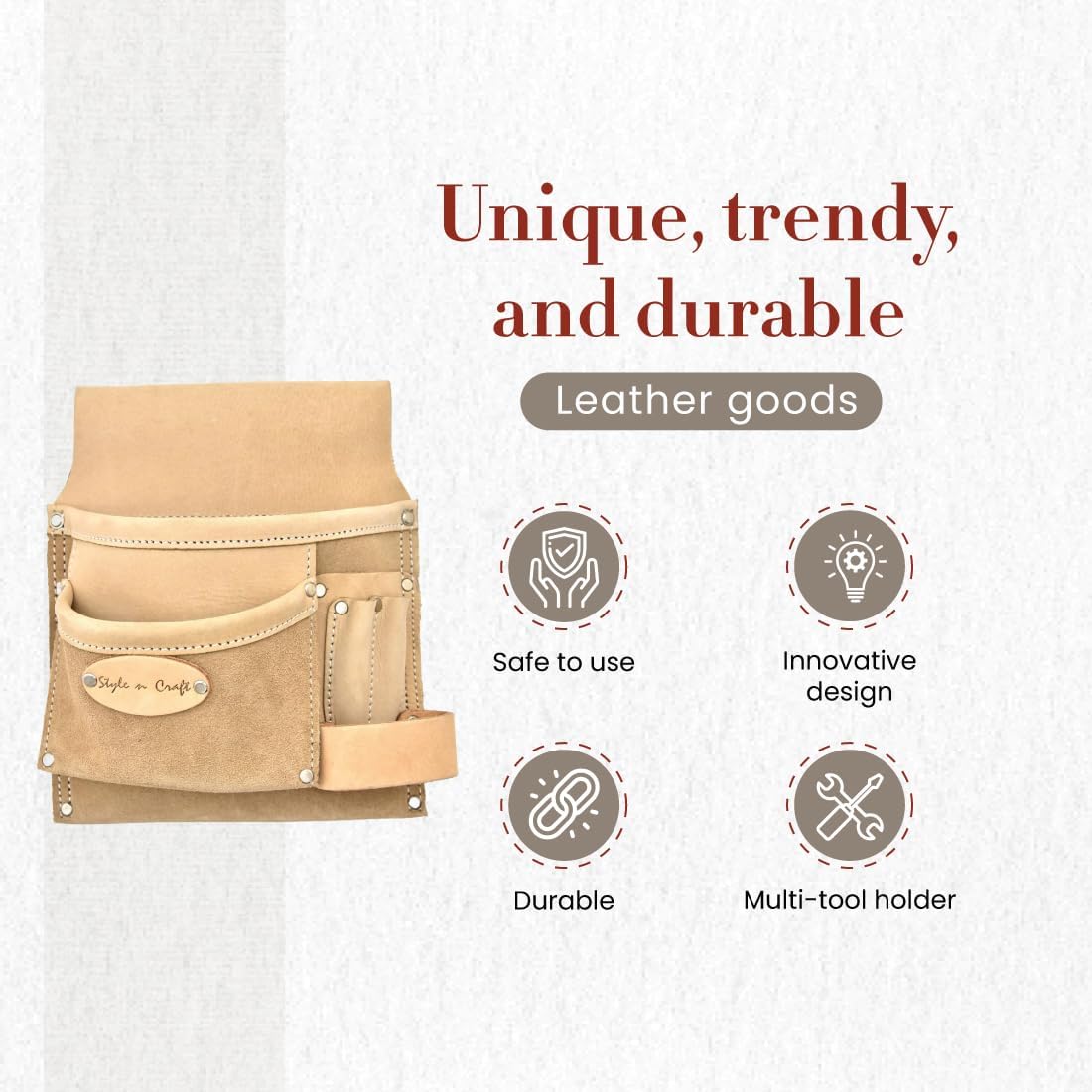 Product Description Stylish and durable, switch to the Style n Craft 5-Pocket Nail and Tool Pouch now! This tool pouch is made with full-grain leather and features heavy-duty nylon thread stitching that offers extra strength and a stylish appearance. Our nail and tool pouch features 5 pockets and will keep your tools, including screwdrivers, chisels, nail sets, pencils, and clamps, among others, protected. The leather pouch is also equipped with a heavy-duty, full-grain leather hammer loop. Reinforced with capped rivets, our tool pouch is reliable and safe to use. The leather tool pouch features a nickel finish on all metal hardware. The tool pouch can be easily attached to belt sizes up to 2-3/4” wide with the help of its tunnel loop. This tool pouch is ideal for small, odd jobs around the house or for kids learning to do small stuff in the household. From the Manufacturer 5 pocket tool pouch in heavy top grain leather in gray color ; 2 main pockets with 3 smaller pockets; stitching with heavy duty nylon thread.