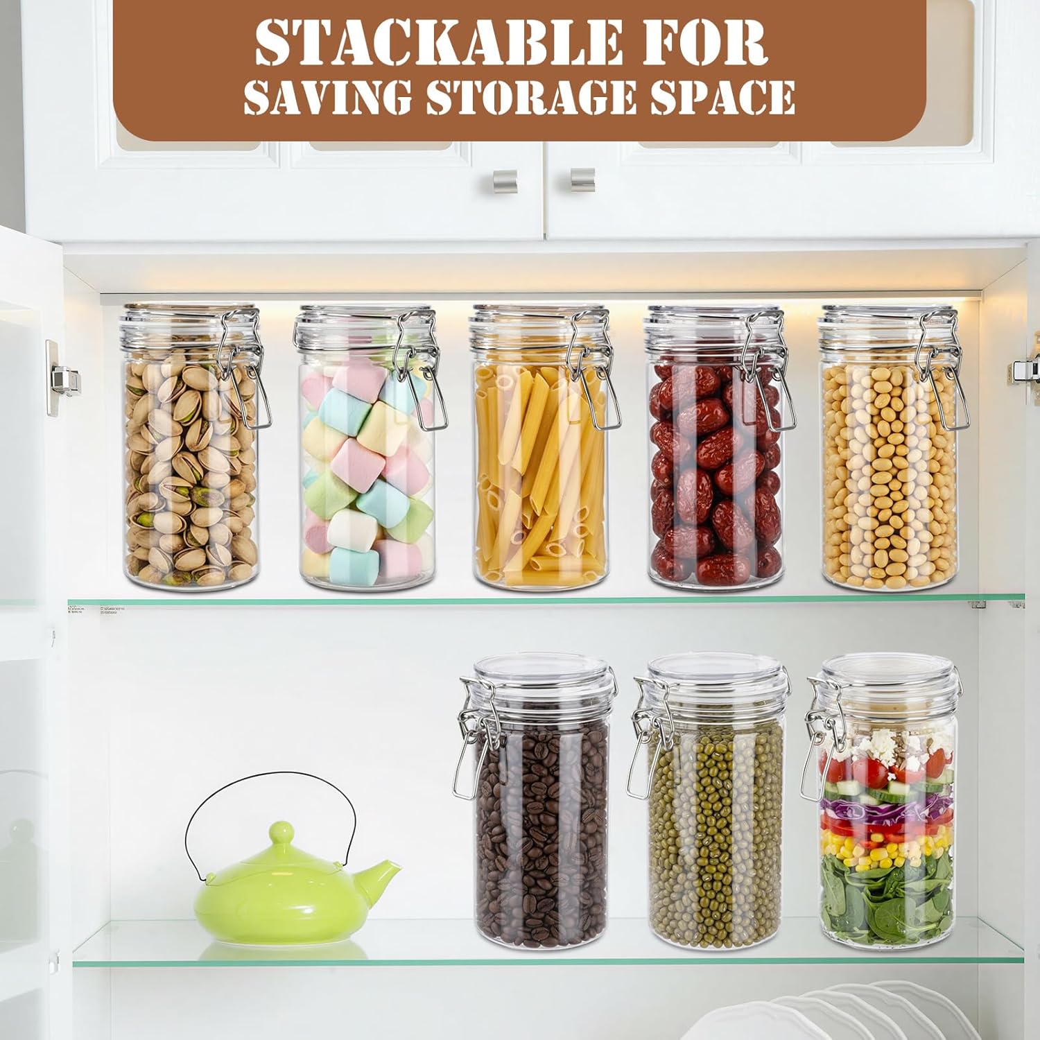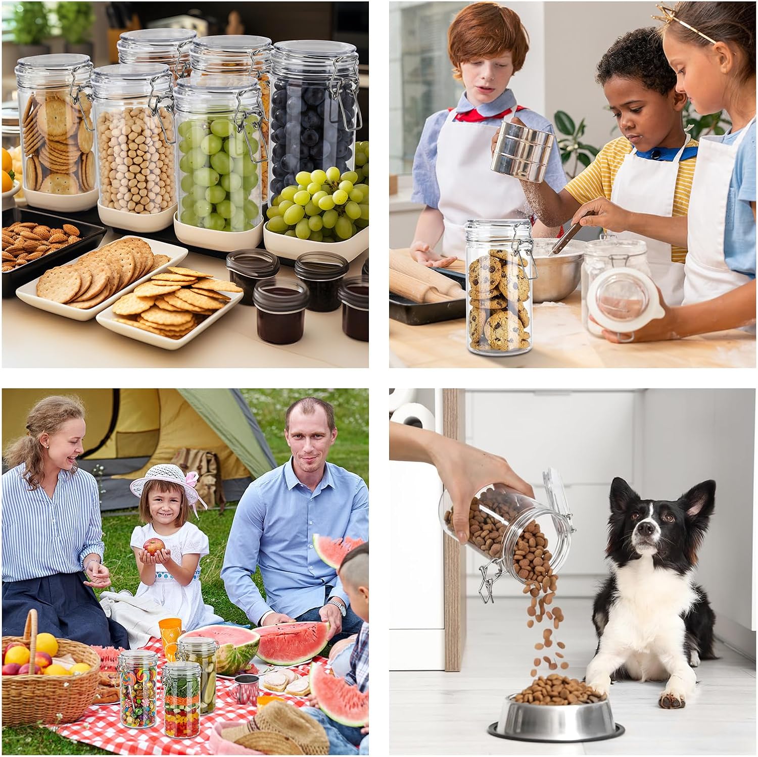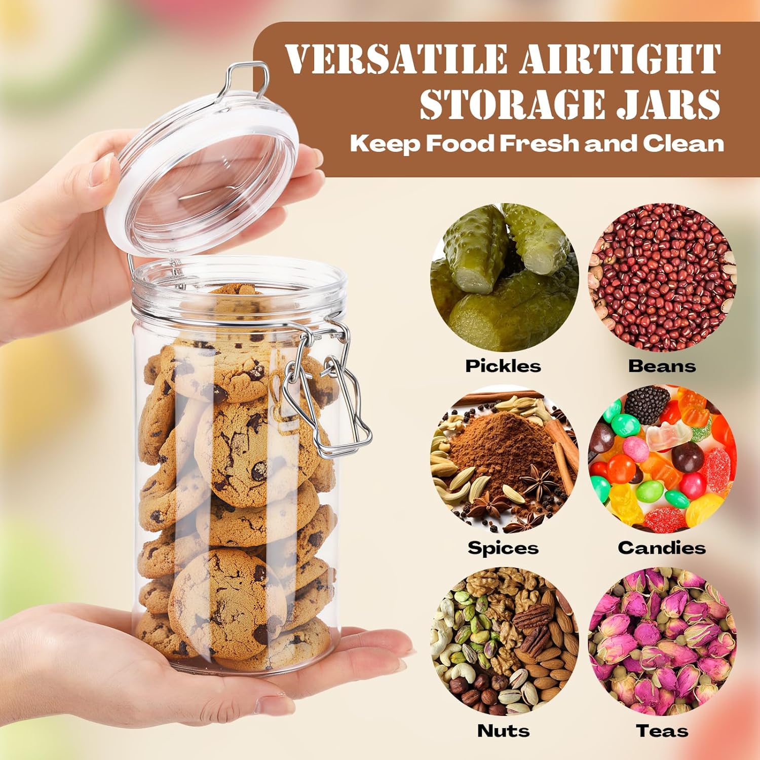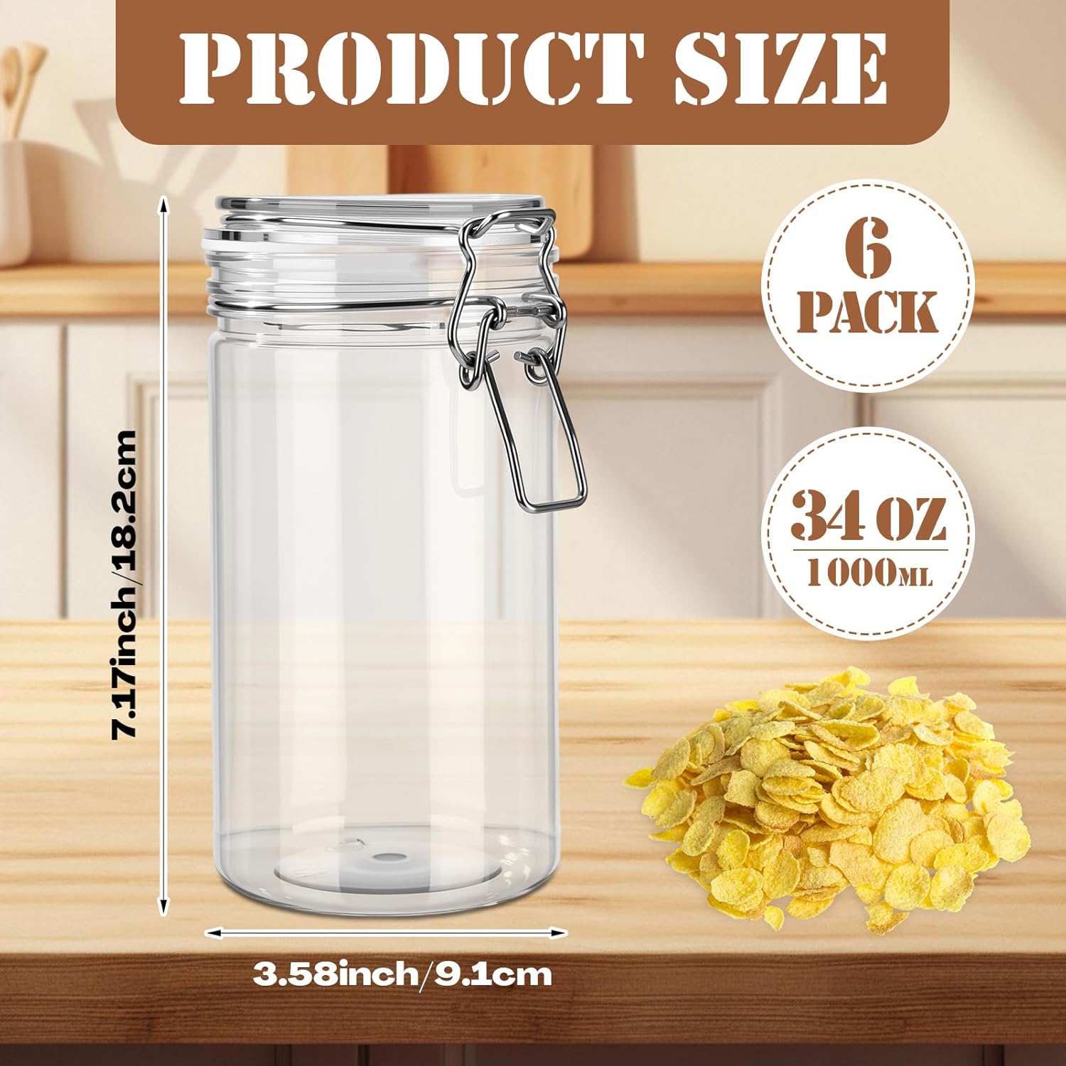 Features: Plastic Jars Bulk: Includes 6 pack plastic storage jars with lids, each with a 34oz / 1000ml capacity. You can use these empty clear plastic food storage jars to store and preserve dry goods, beans, flour, cereal, pasta, or snacks. Ample quantity of airtight food storage containers provides an efficient solution for kitchen pantry organization, while also meeting business needs such as trade show displays and product sampling Airtight Design: The plastic sealed food storage containers are equipped with an airtight lid, featuring an integrated silicone gasket and a metal locking clamp. This airtight design ensures leak-proof and excellent airtight seal performance, keeping your dry food clean, fresh, and safe during long-term storage Specifications: Material: plastic Color: clear Size: about 34oz / 1000ml Package includes: 6 x Plastic Storage Jars with Lids Notes: Manual measurement, please allow slight errors on size. The color may exist a slight difference due to different screen displays.