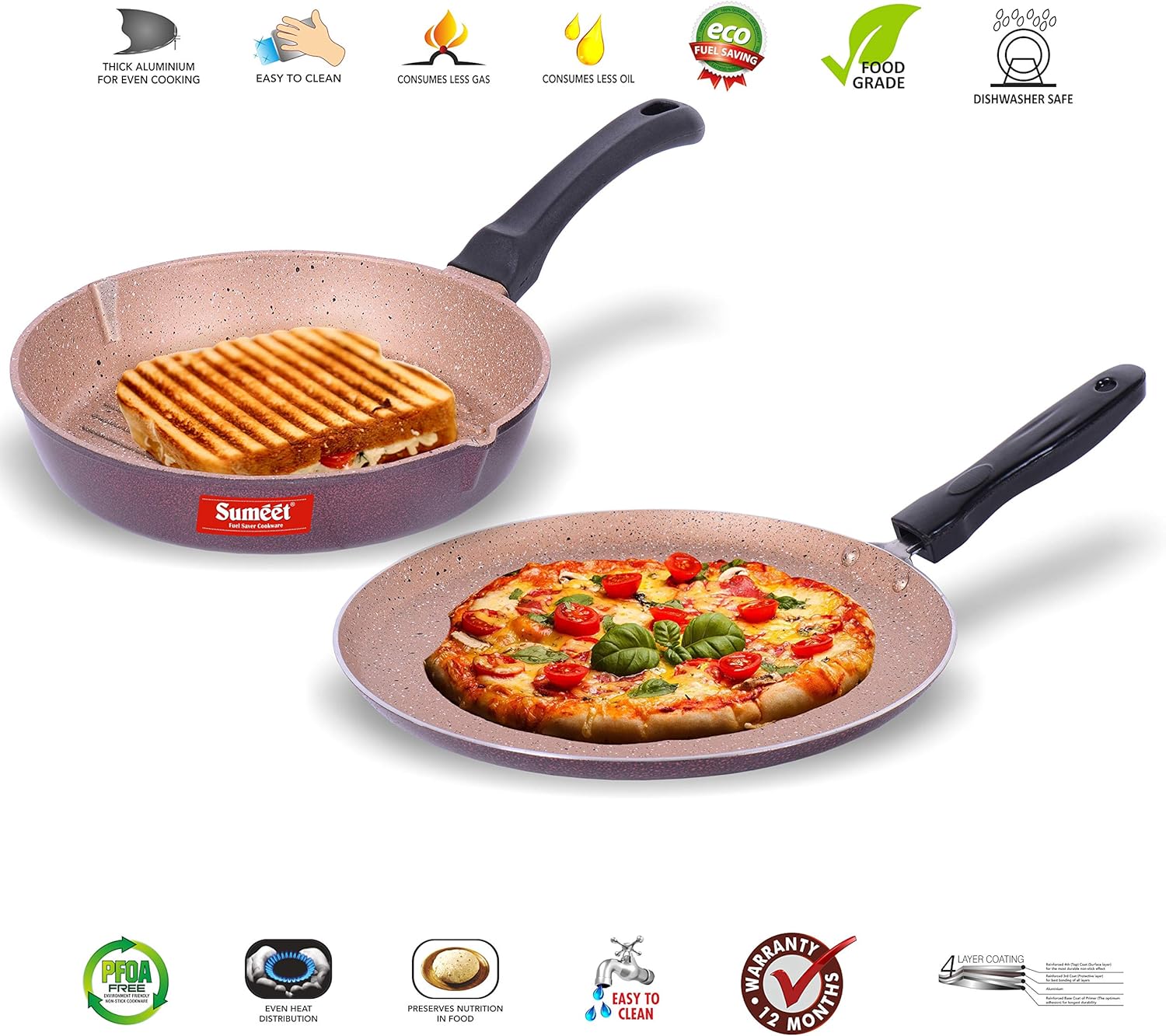 Sumeet Cookware brings to you 2pc Kitchen Set “Favorite”.This 2pc Kitchen Set “Favorite” is best for the Perfect Professional Results for the Home Chef. We’re proud to be at the forefront of creating innovative ideas and producing sleek, stylish finish cookware’s for today’s kitchens. The Sumeet 2pc Kitchen Set “Favorite” consists of Round shape Grill pan and Tawa. Round Shape Grill Pan: Sumeet Round Shape Nonstick Grill pan is made of thick aluminum die-cast with contoured handle for easy lifting which saves your time. This Round grill pan is constructed from heavy-duty die - cast aluminum that heats quickly and evenly to help reduce hot spots that can burn food and Even Heat Distribution saves your time and money. It Leaves Appetizing Grill Stripes on the food which look awesome. Tawa: Sumeet introduces a brand-new granite finish 3mm Thick tawa that is specially crafted for Indian cooking. Designed after a year-long research on material and coating, is the most suitable for making Indian breads (roti, paratha, chilla, etc). Moreover, the handle has a special loop which permits one to hang this tawa on the wall. This 2pc Kitchen Set “Favorite” comes with a hammer tone finish on the bottom to resist extra heat while cooking and saving your food from getting burned. The Granite Nonstick Interior Allows Fast and Easy Food Release and Makes Cleaning A Breeze. Tawa Dimension - L X W X H (cms): 26.5 X 26.5 X 1.5 Capacity in Litres - NA Weight – 0.540 Kgs Round Shape Grill Pan Dimension - L X W X H (cms): 25.5 x 25.5 x 5.3 Capacity in Litres – 1.9 Weight – 0.840Kgs