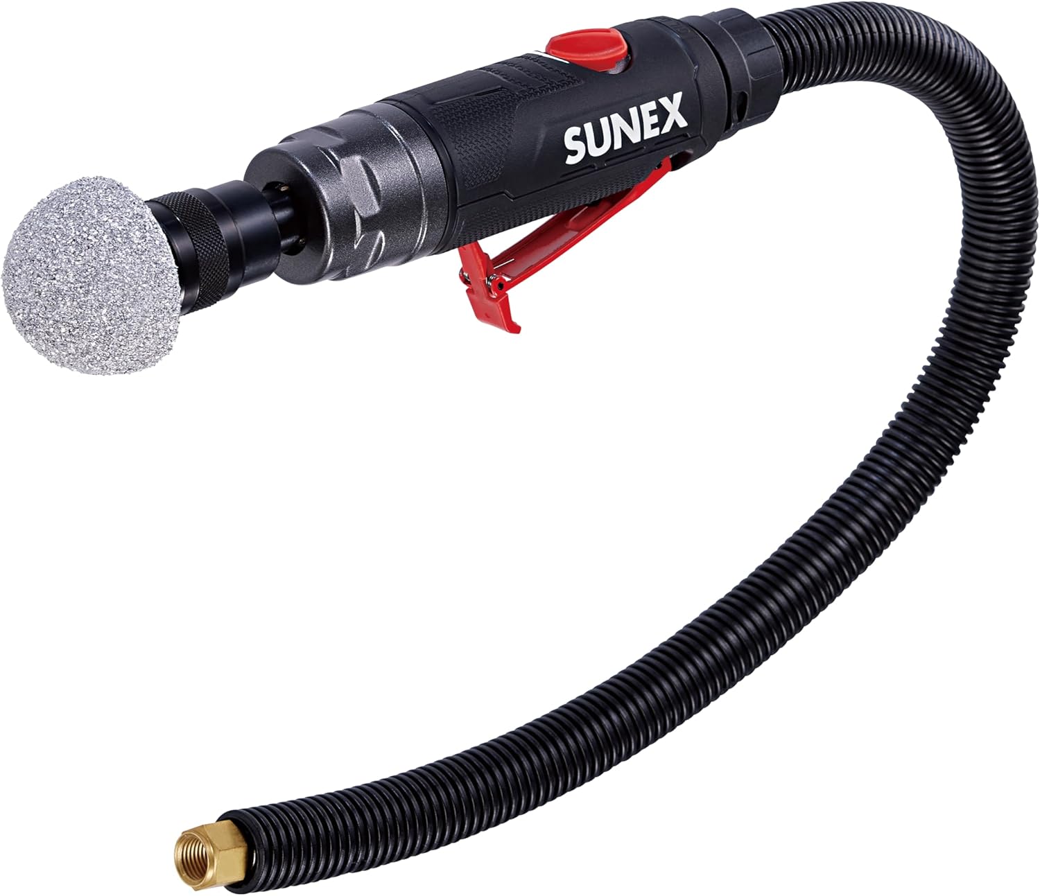 The SUNEX Tools SX8202 0.5HP Tire Buffer delivers precision, control, and power for professional tire repair and preparation. Engineered with a strong 0.5 horsepower motor, this compact pneumatic tool provides consistent torque and a free speed of 3,600 RPM—ideal for buffing, patching, and surface texturing. The 5/16" hex quick-change chuck allows fast, tool-free accessory swaps, while the adjustable power regulator offers precise speed control to match each task. Its lightweight composite housing and ergonomic overmold grip reduce vibration and fatigue, making it comfortable for extended use. Designed with safety and efficiency in mind, the SX8202 features a safety lock-off trigger to prevent accidental starts and runs on just 3.5 CFM at 90 PSI. The 9-inch compact frame makes it easy to maneuver in tight spaces around wheels and sidewalls. Whether you're working in a tire shop, fleet maintenance bay, or mobile repair van, the SUNEX SX8202 combines performance, durability, and user comfort to meet the demands of daily tire service.