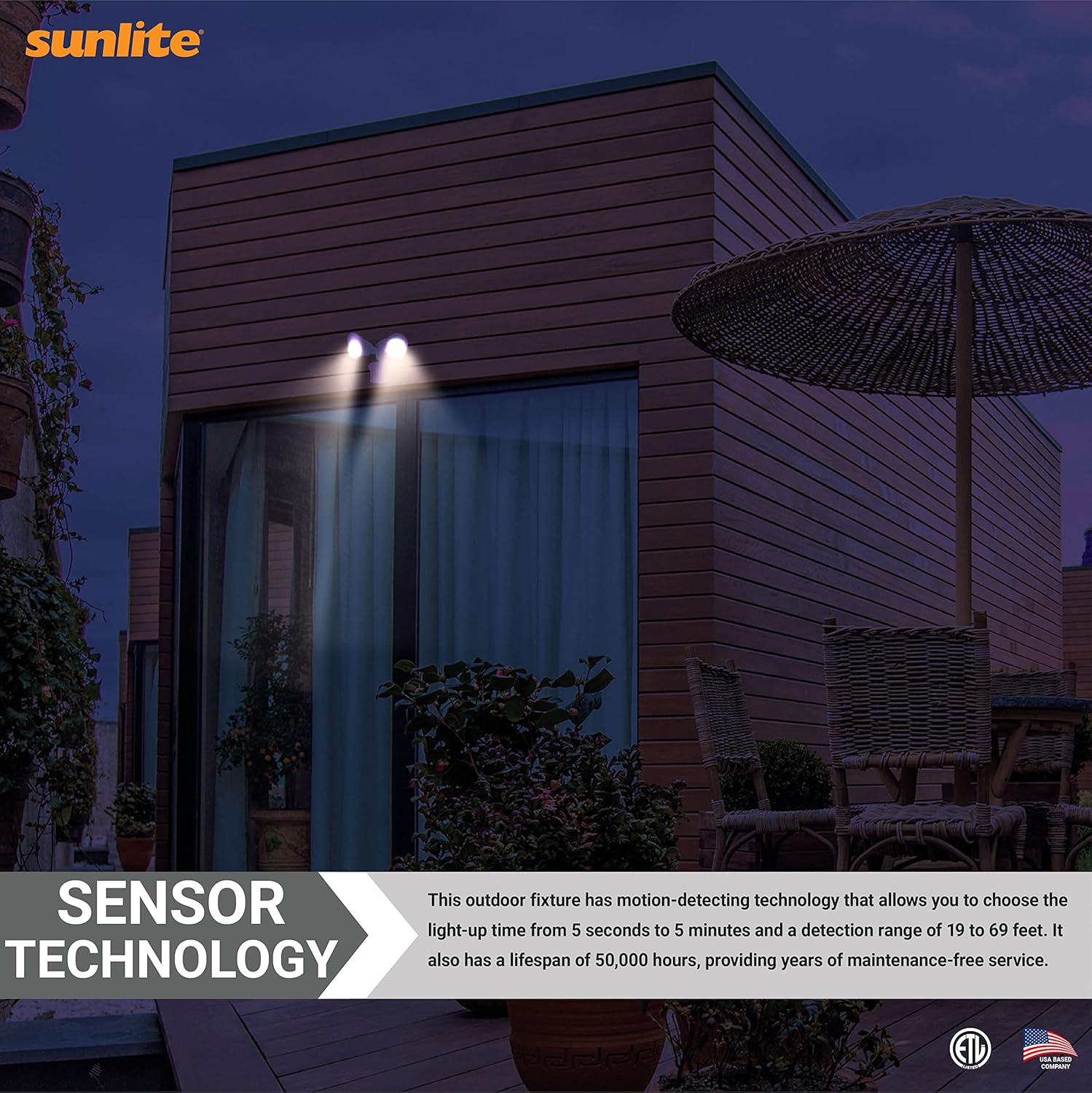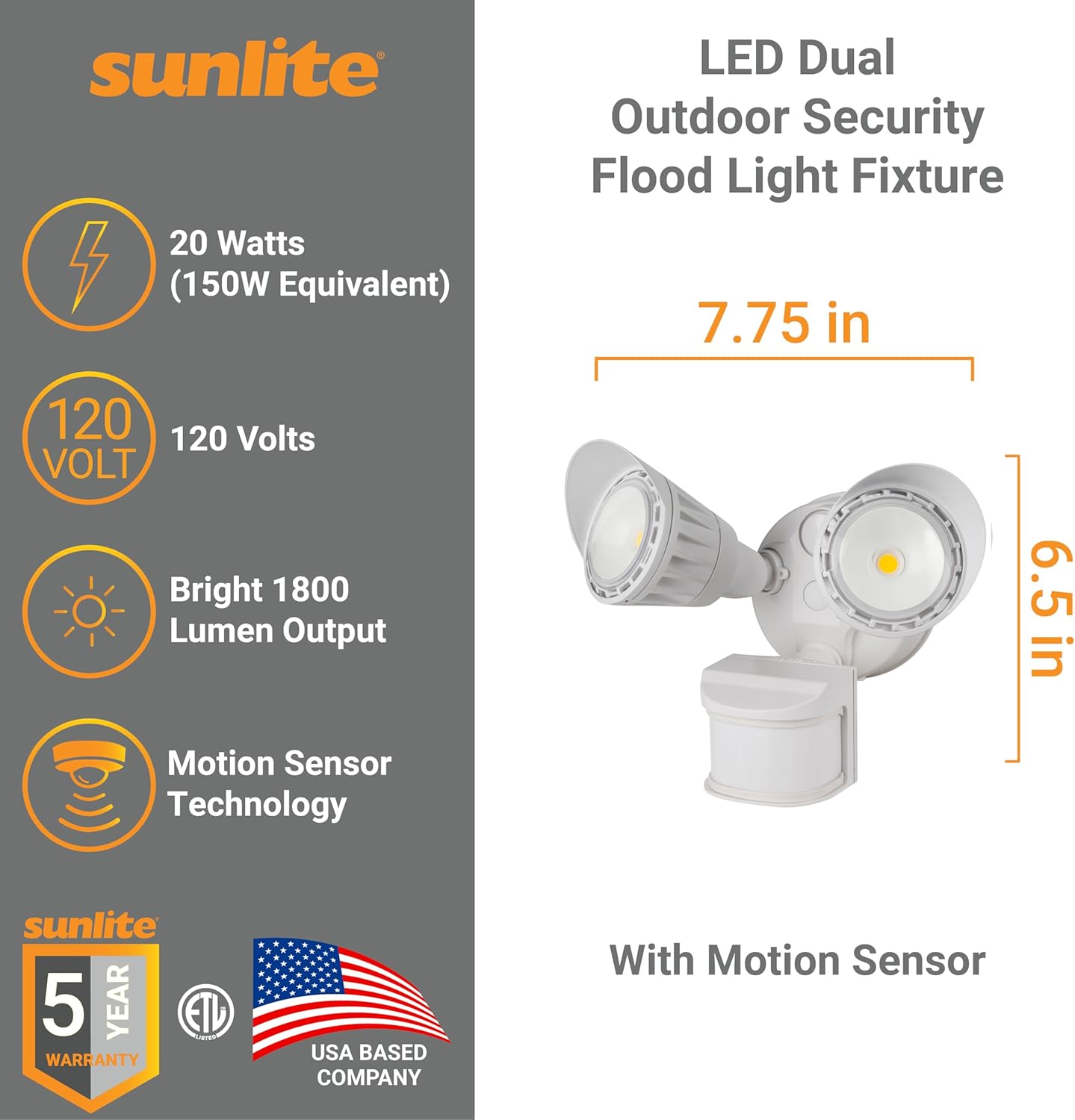 Sunlite's LED dual head security light delivers super bright light with high energy savings. It features motion detection technology, daylight detection ability, easily rotatable lights, and a sensor for preferred positions. It is ideal for entranceways, porch lights, garages, and general security and safety applications. It draws only 20 watts (replacing 2 PAR38 light bulbs) while producing bright 1800-lumen light. Its durable weatherproof aluminum and plastic materials will withstand even extreme weather. The various function options provide full control and flexibility for activating the light. On-time mode allows the light to run constantly. Auto mode will enable it to activate only when motion is detected, with the ability to control the detection distance from 19.5 to 69 feet. The time function allows for controlling the length of time the light remains on, from 5 seconds to 5 minutes. D2D mode activates the light from dusk to dawn with the ability to control the fixtures' sensitivity to daylight. This fixture features a long life span of 50,000 hours and is ETL listed for outdoor locations. All mounting hardware is included for simple mounting onto a junction box.