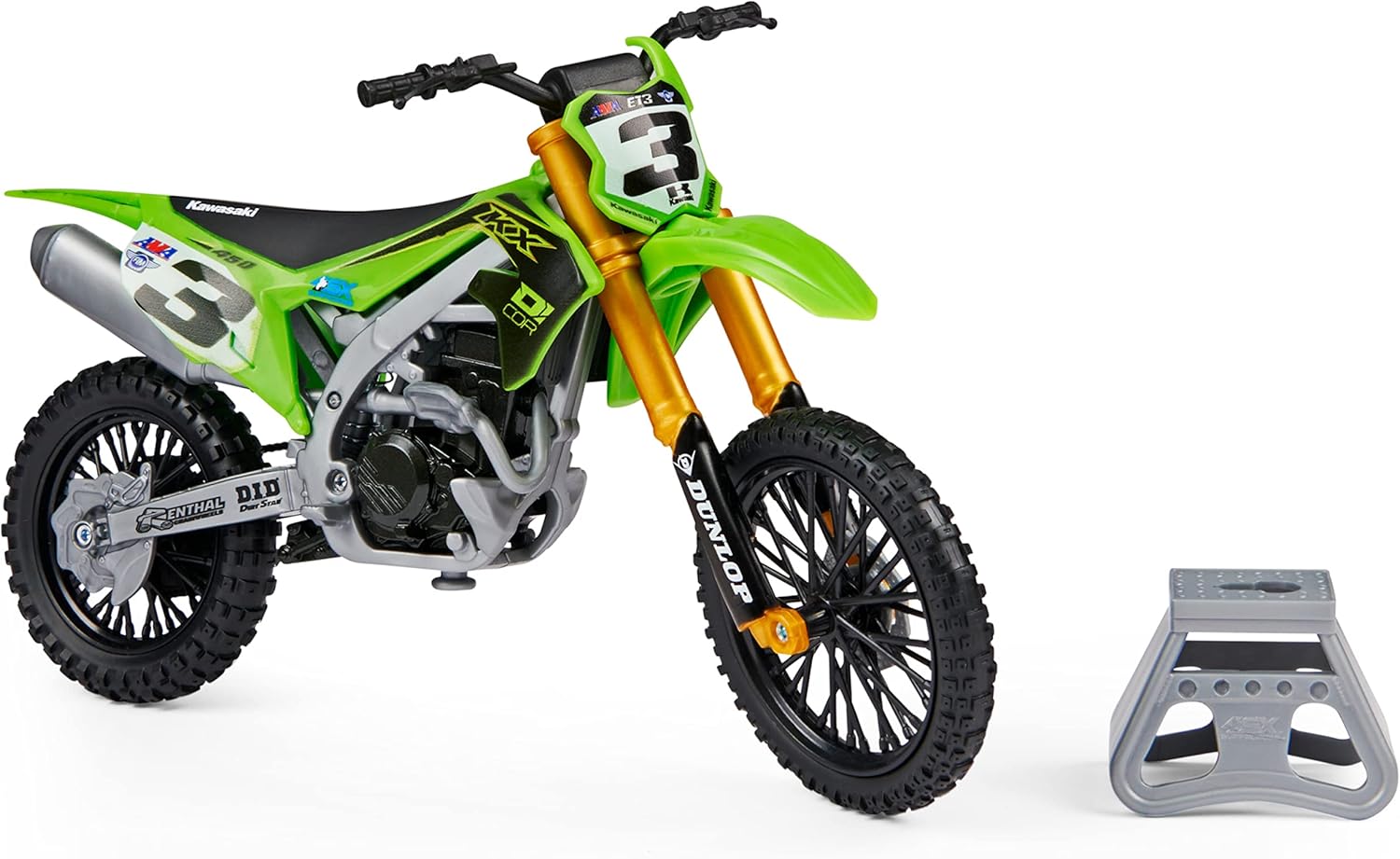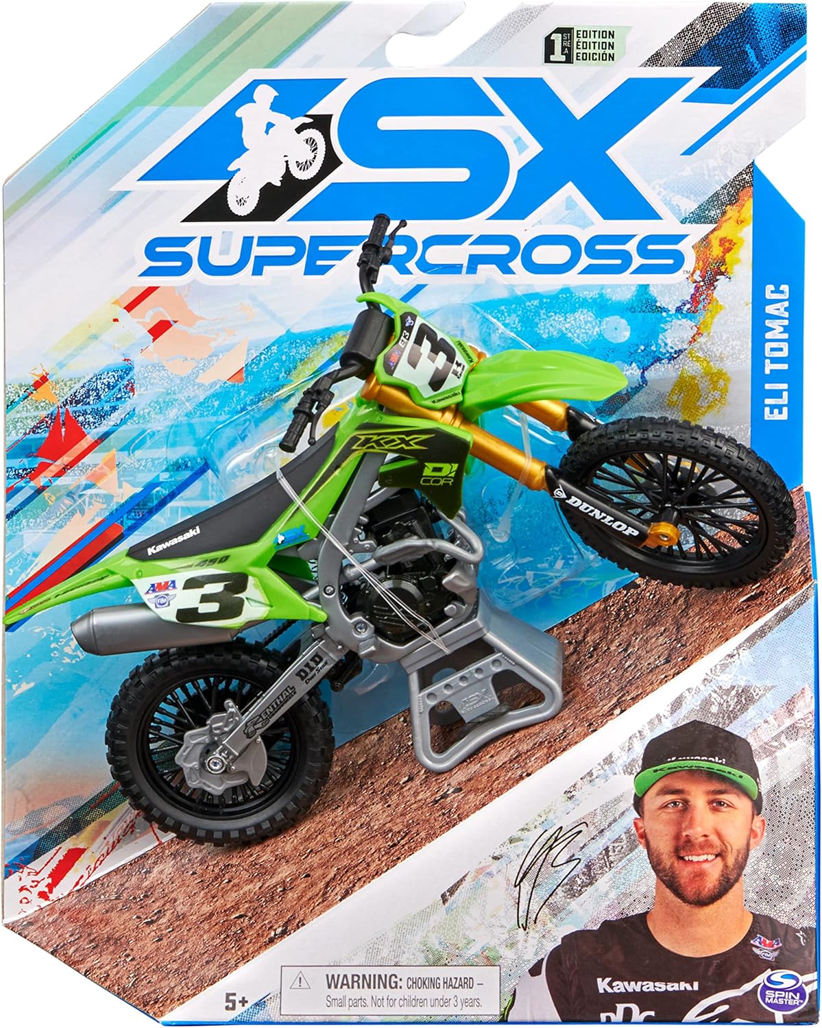 Feel the adrenaline with the all-new, official 1:10 scale die-cast Supercross motorcycles! These authentic racing replicas are highly detailed and look just like the powerful bikes the top pro riders use! Featuring realistic details and graphics, working rear suspension and metal die-cast motors, the 1:10 scale Supercross dirt bikes bring the action and excitement you’ve seen in live events into your home. Turn your living room into a Supercross stadium and race through obstacles, pulling off hairpin turns, whoops, high jumps and more to become Supercross Champion with your very own replica! Each 1:10 scale Supercross bike also includes a display stand, so you can show off your dirt bike in style. Collect all of the 1:10 scale Supercross motorcycles, including replicas of Justin Brayton, Ricky Carmichael, Justin Hill’s bikes and more (each sold separately)! Experience epic Supercross action right at home with the official 1:10 scale die-cast Supercross motorcycles!