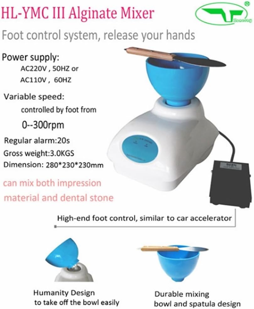 Technical Data: 1. Power supply: AC220V,50Hz;or AC 110V,60HZ 2. Speed:According to your needs range from 0 to 300 rpm,speed controlled by the foot control, which allows you to further release your hands, enjoy the driving pleasure, bring you to" fly" feeling; 3. Timing alarm: set the working time 20 seconds, after 20 seconds warning lamp flashes, beeps, remind the user to use the impression material as soon as possible, avoid drying or coagulating; 4. Overload shutdown: when the force caused the motor overload, it will automatically stop rotating after 3 seconds, then press the start button, start again; 5. Gross weight: 3.0 Kg; 6. Using the latest foot switch control. Similar to automobile accelerator; 7. Adopt the large LCD display, which can bring vivid image, let you be full of wit and humour in operation.