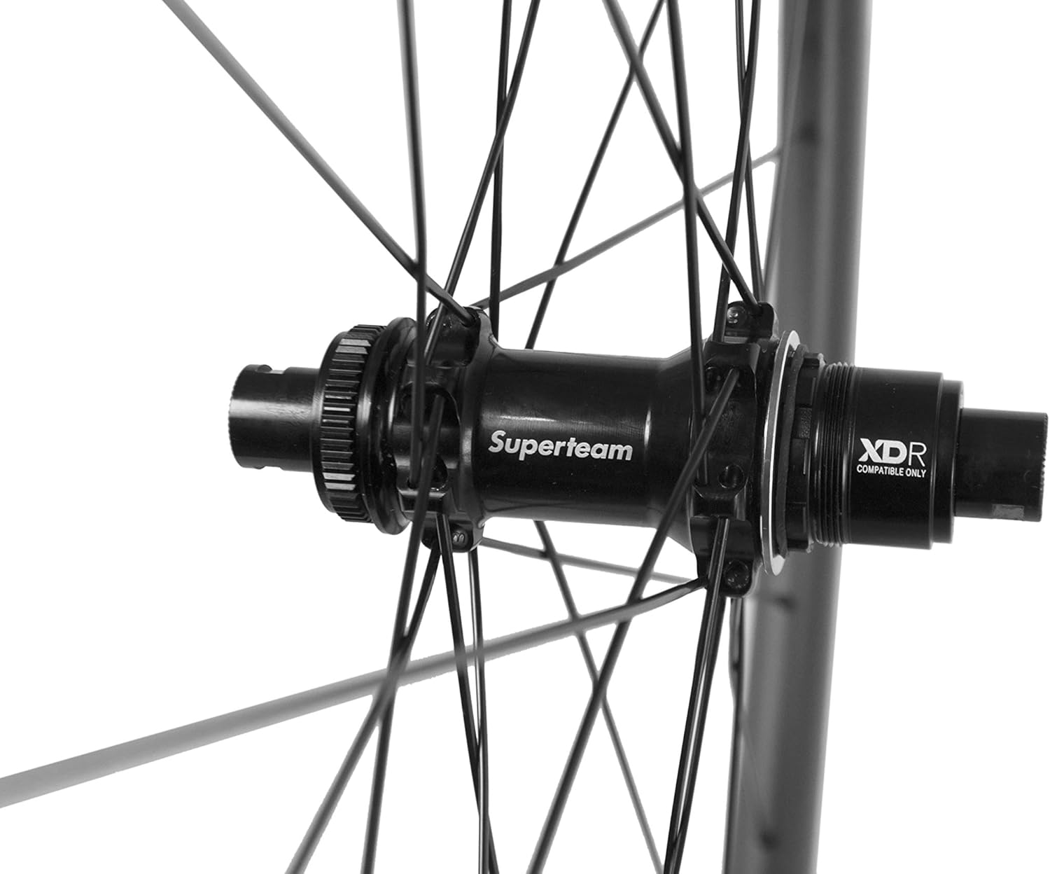 Rim Finish: UD matte Rim width: 25mm Rim Depth :45mm Drill:Front 24 Rear 24 holes Design:12-layer carbon on brake track with braking line Hub:CX6 center lock thurx alxe 12*100-12*142 Cassette body: For Sram XDR 12 Speed Spoke: CN494 (black) Nipple:CN alloy external nipple Brake pads:no need Max recommend rider weight:120kg Max recommend tyre pressure:125PSI Weight of wheelset:Front 840g±30g/pair Rear 960g±30g/pair.