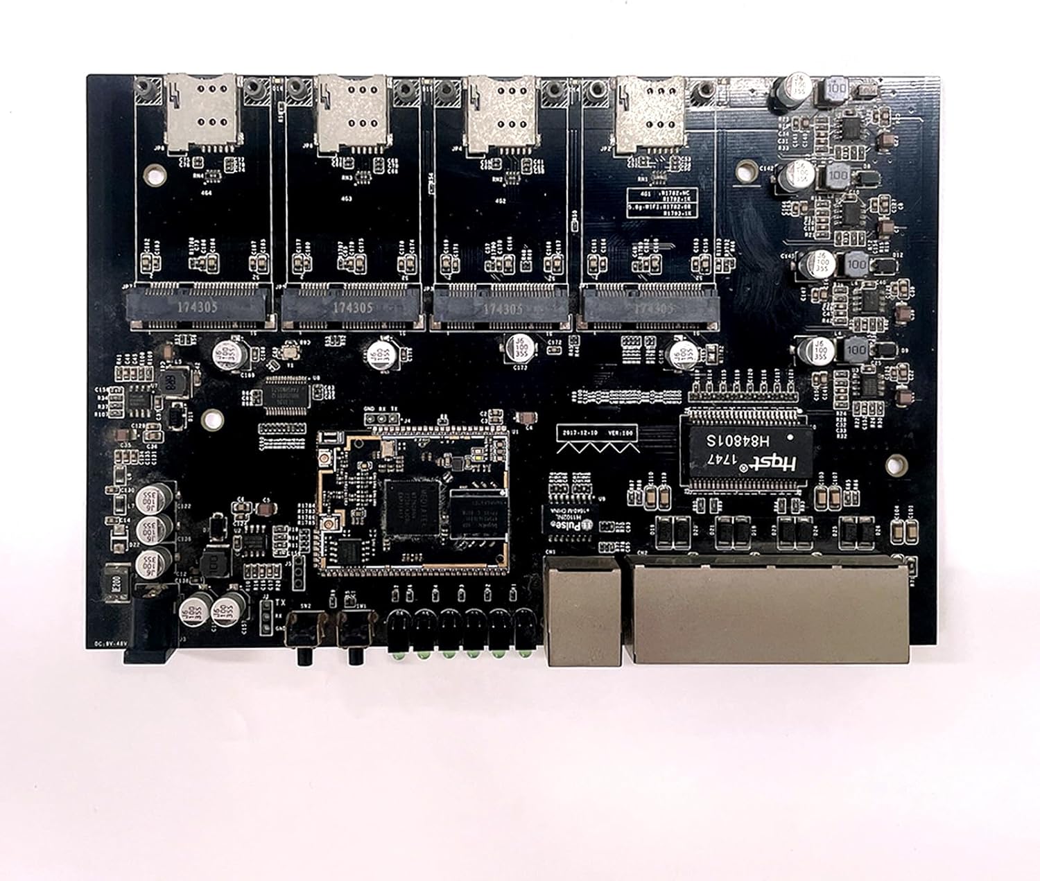 This is a Printed Circuit Board Assembly (PCBA). It uses a black substrate as a whole, with various electronic components such as capacitors and chips densely distributed on it. The board is equipped with multiple RJ45 network interfaces, a design typically used in network devices such as routers, switches, or network server motherboards. It enables high-speed data access and transmission, meeting the requirements for network connection and data processing in scenarios such as multi-device networking or data centers. With a compact layout and high integration level, it reflects the demands of modern electronic devices for efficient data transmission and processing, and is suitable for application environments requiring stable network communication.