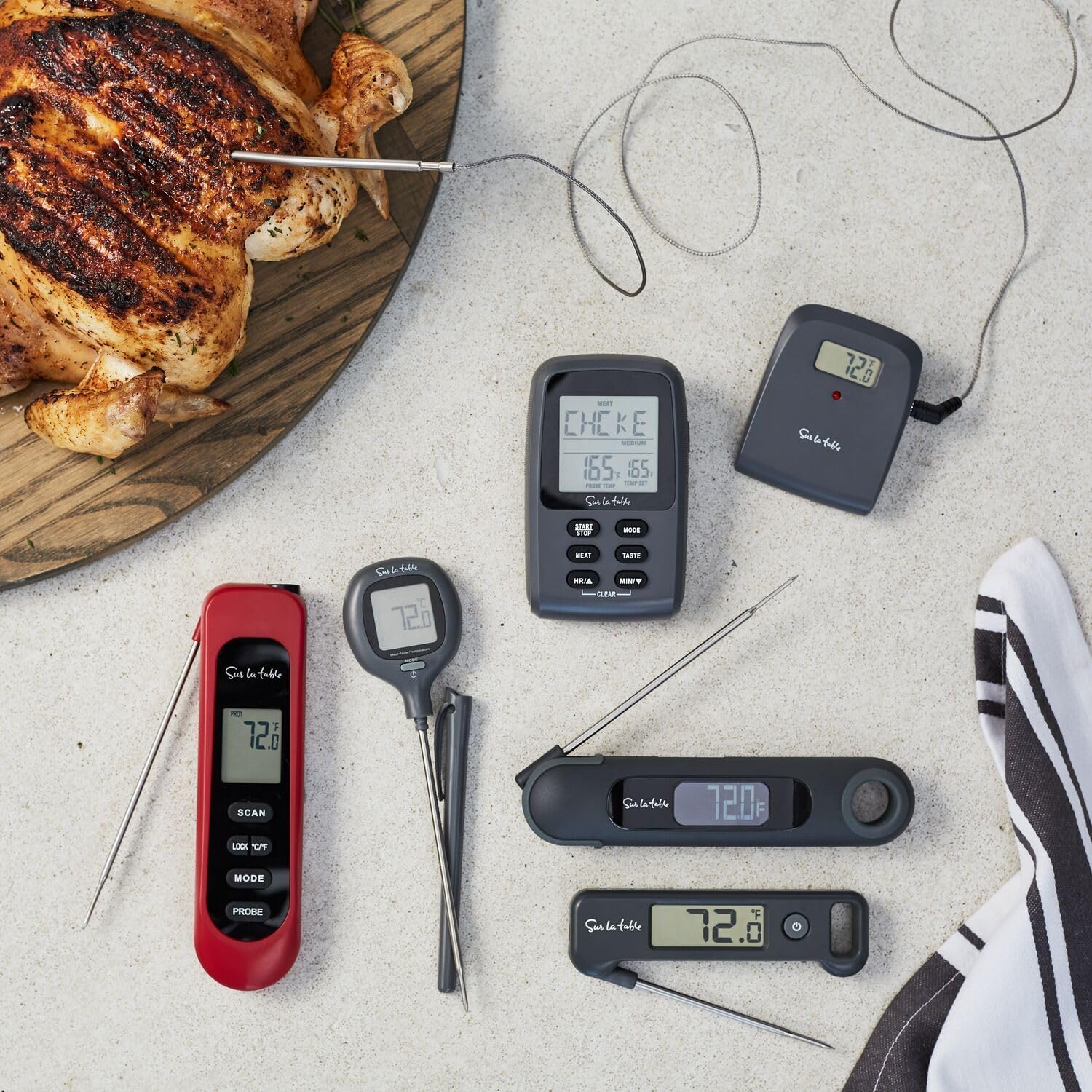Achieve perfectly cooked steaks, chicken and more every time with this portable thermometer that gives you results in seconds. The thermometer can read temperatures between -58°F and 572°F and reads temperatures in three ways–leave-in probe, instant-read probe and infrared–all via a backlit LCD screen that is easy to read, even in the dark. The foldable design and removable probe make this thermometer easy to travel with–perfect for taking to your next BBQ.