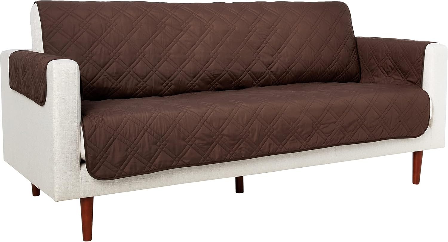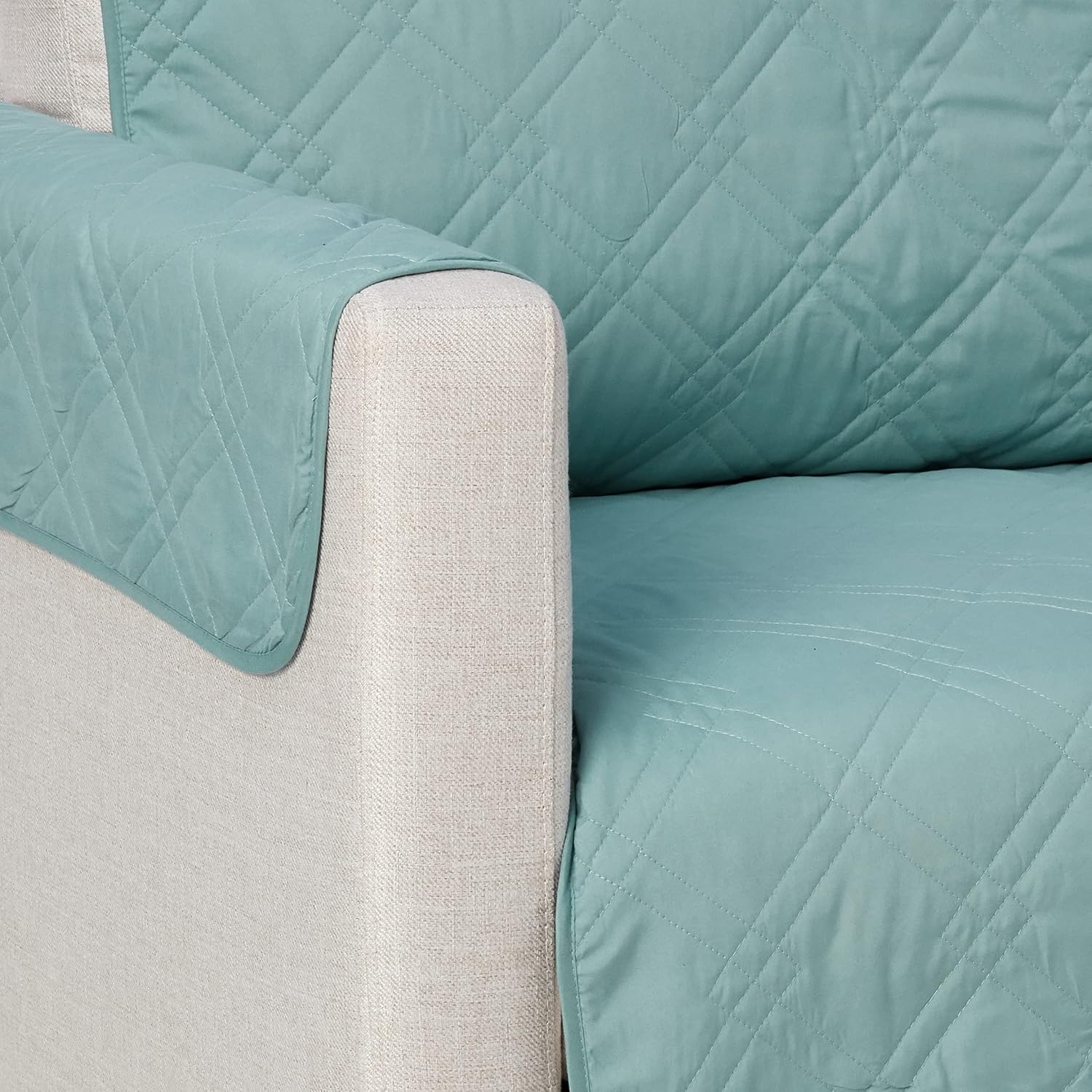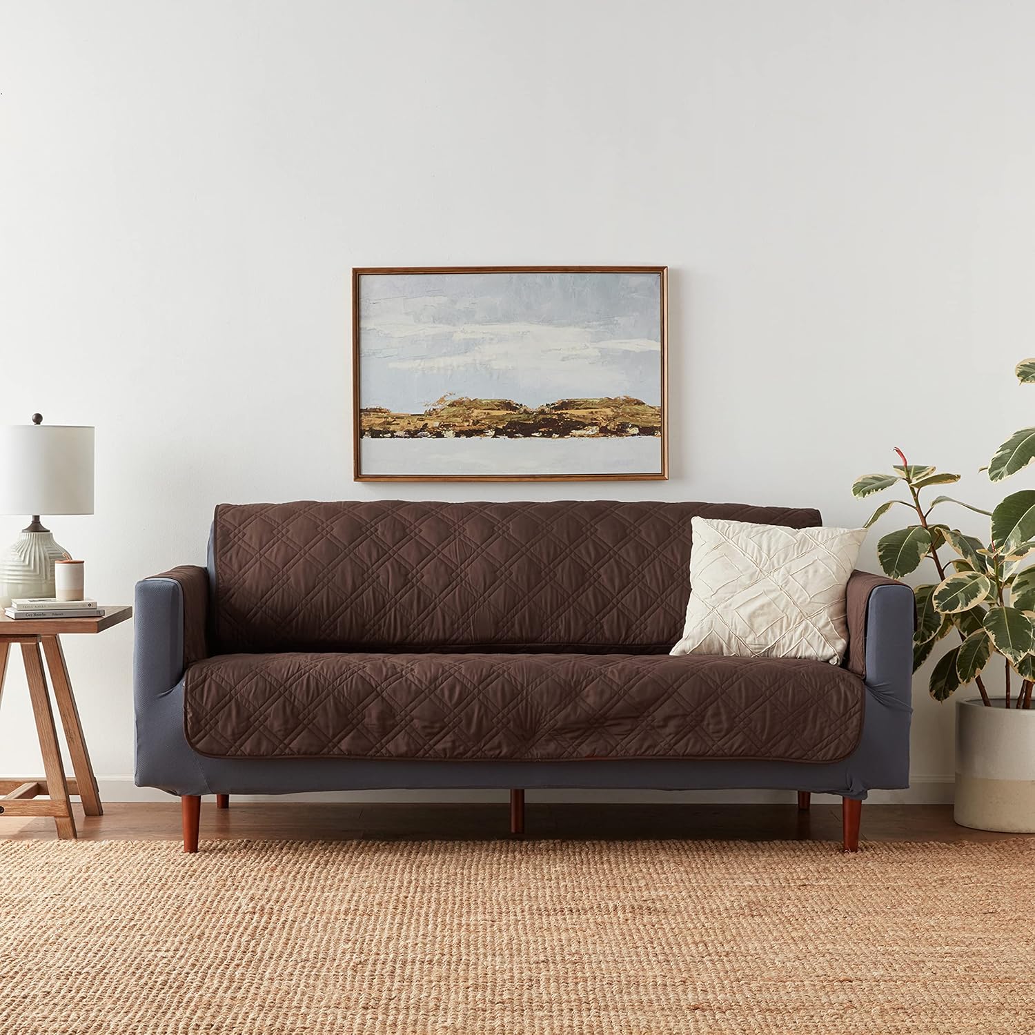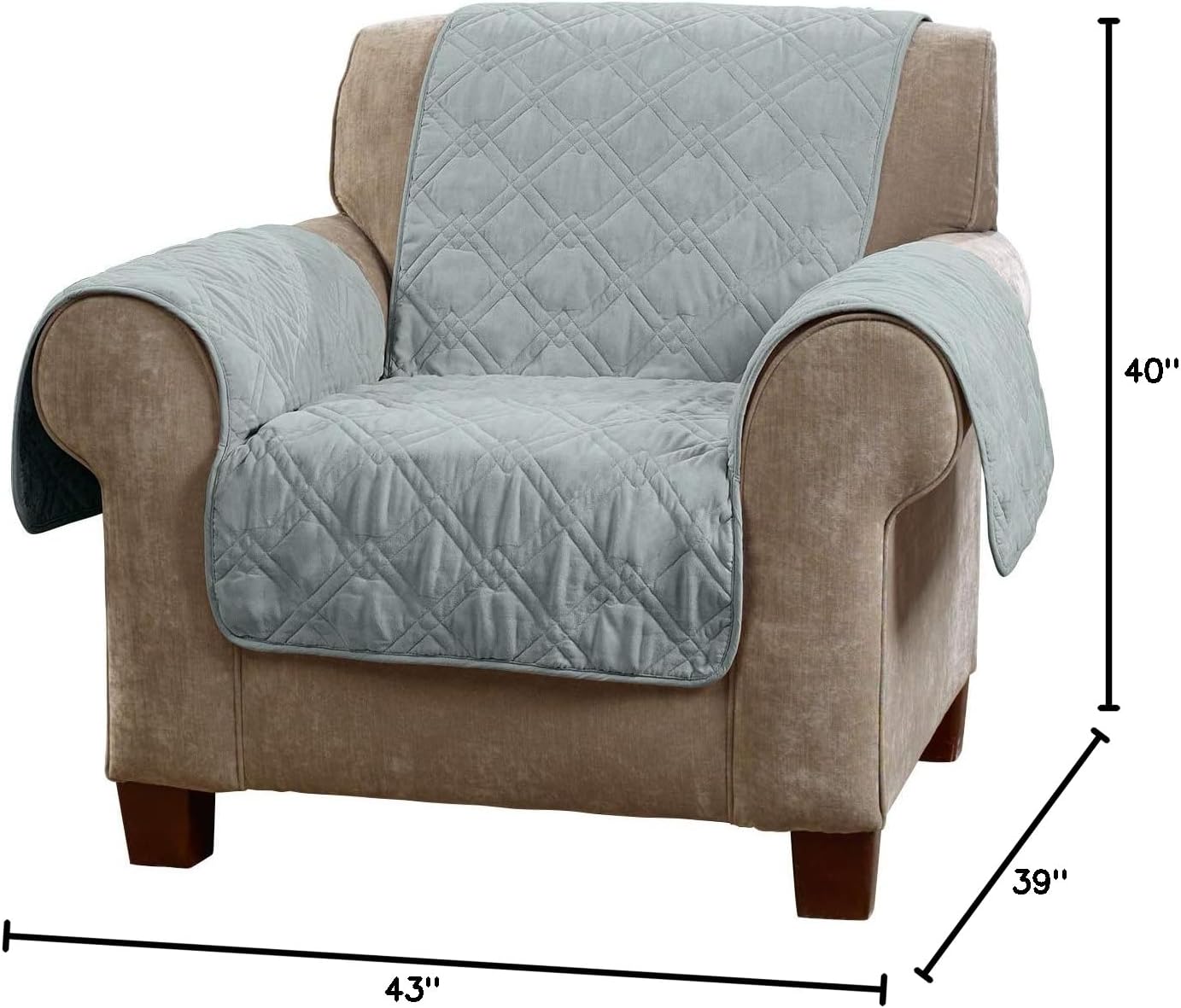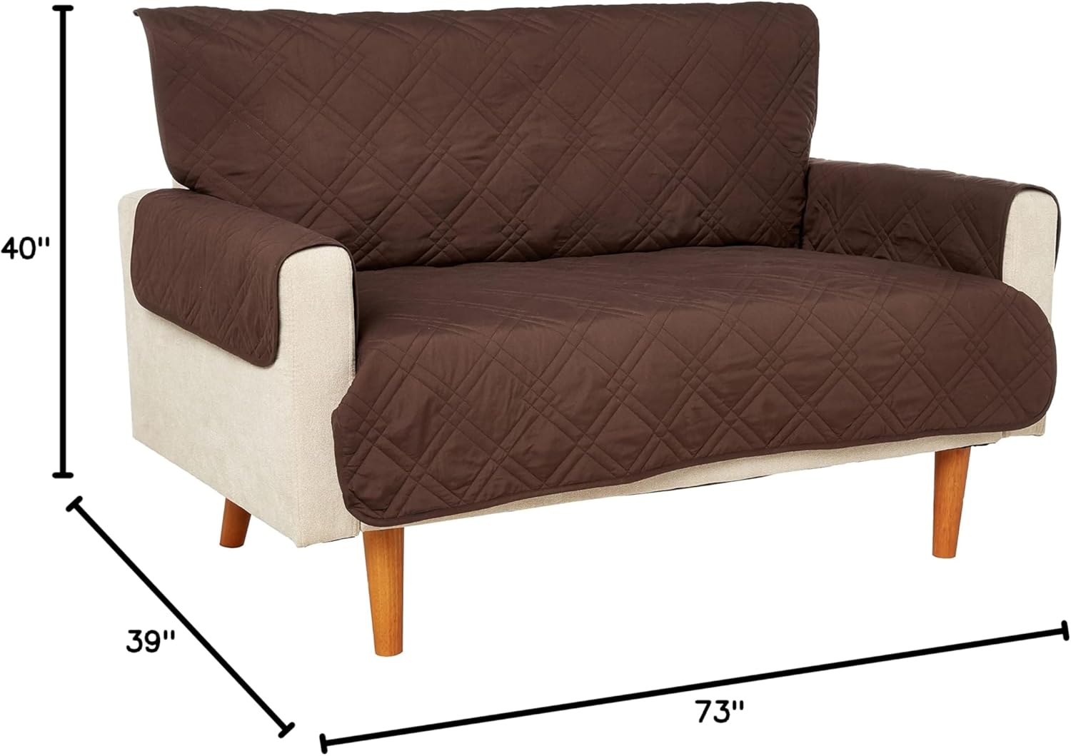 Sure Fit Home Décor Microfiber Pet Loveseat One Piece Quilted Furniture Cover, Relaxed Fit, Polyester, Machine Washable. Quick fix! Fast and easy, our Microfiber Furniture Cover is the agile antidote to pets, kids or any mess that comes your way. Ditch the old towel or blanket. This is a more refined solution to the common cover up with a velvety soft feel. Paw print silicone pads ensure a nonslip grip. Finished in an all over diamond quilt design. This is a great option for pet owners; keep your furniture protected from the dirt and fur of your beloved household dog, cat or any pet. Best fits loveseats with seat width 48 to 52-inches wide, up to 36.5-inches seat depth, 22-24.5-inch arm depth, with 39 to 50-inch back drop and 22 to 25.5-inches over-arm drape. Made of 100% polyester. Paw print silicone pads for nonslip grip and extra-long back drop. Machine wash separately in cold water on gentle cycle and tumble dry low.