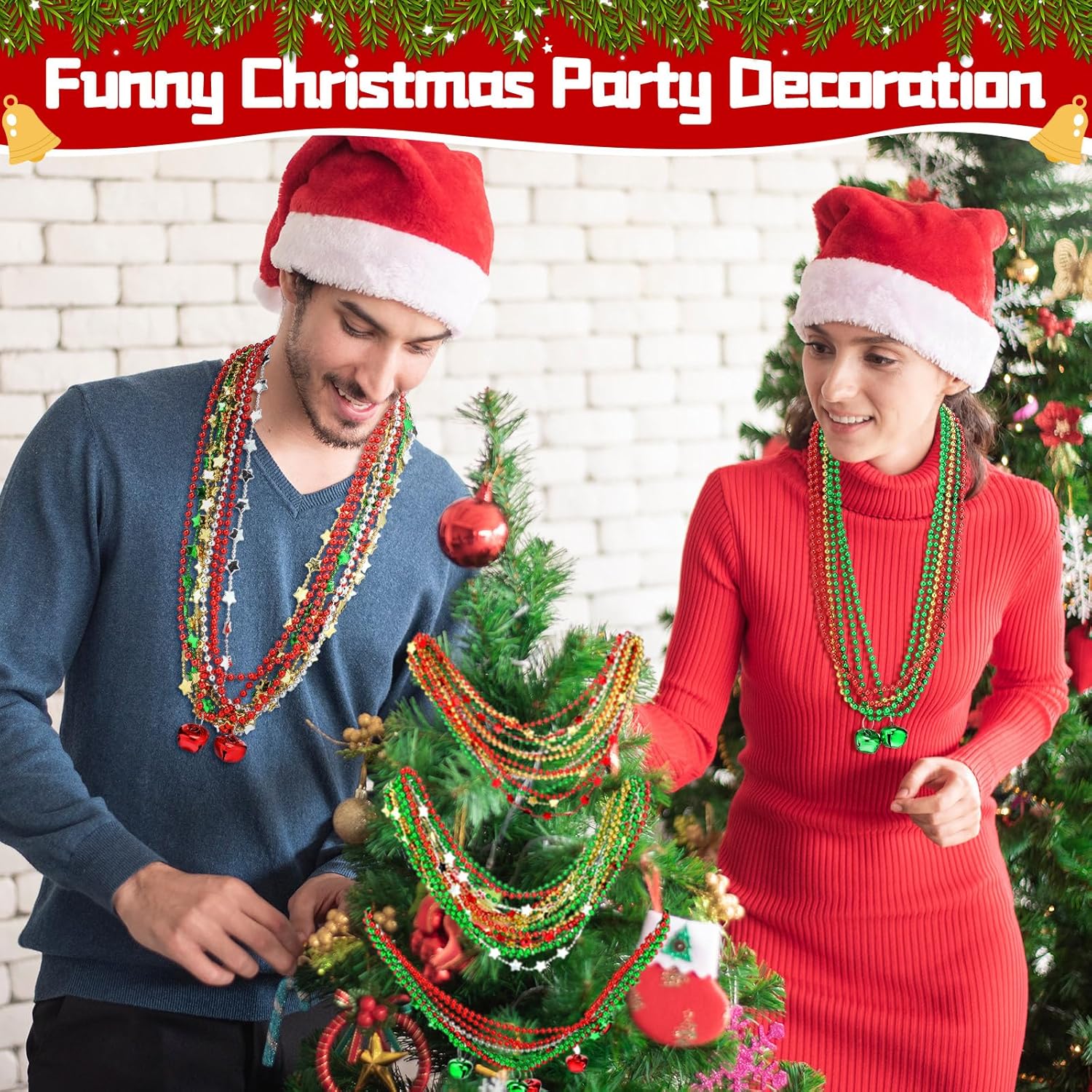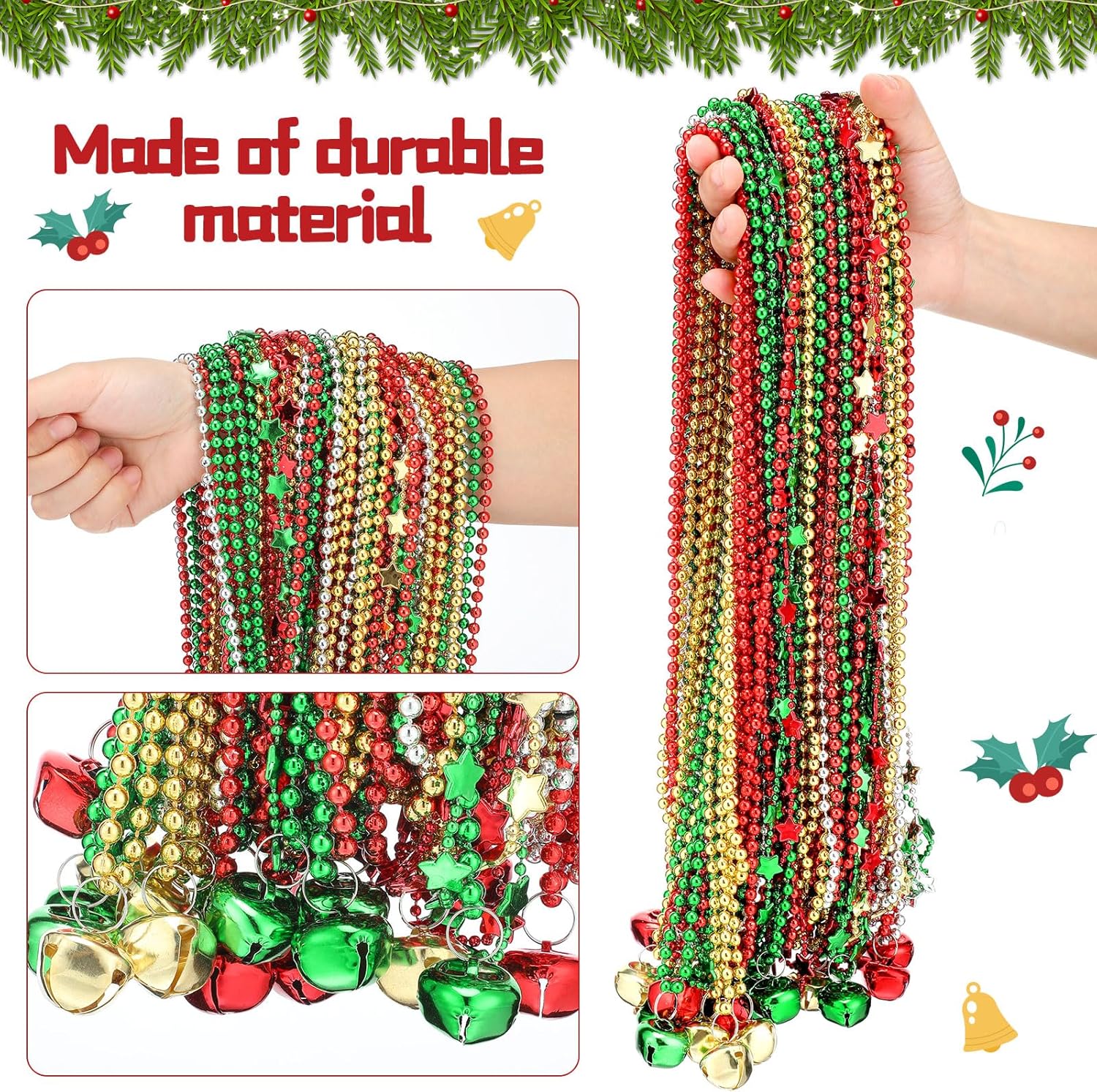 Features: Delightful ringtones: These Christmas beads are crafted from quality golden bells that provide a crisp jingle sound that will add pleasure to your holiday celebrations. Shake them and feel the Christmas ambiance come alive. Ideal Christmas party favor: Christmas bell necklaces can be given as gifts to your friends, family, teachers, and partners to share the joy of the holiday season and spread the festive spirit to every corner. Specifications: Material: plastic Color: red, yellow, green, silver Size: as the picture shows Package includes: 80 x Metal necklaces with star and bead 100 x Metal ball bead necklaces 24 x Jingle bells metal chains Notes: Manual measurement, please allow slight errors on size. The color may exist a slight difference due to different screen displays. Swallowing risk may exist, please keep away