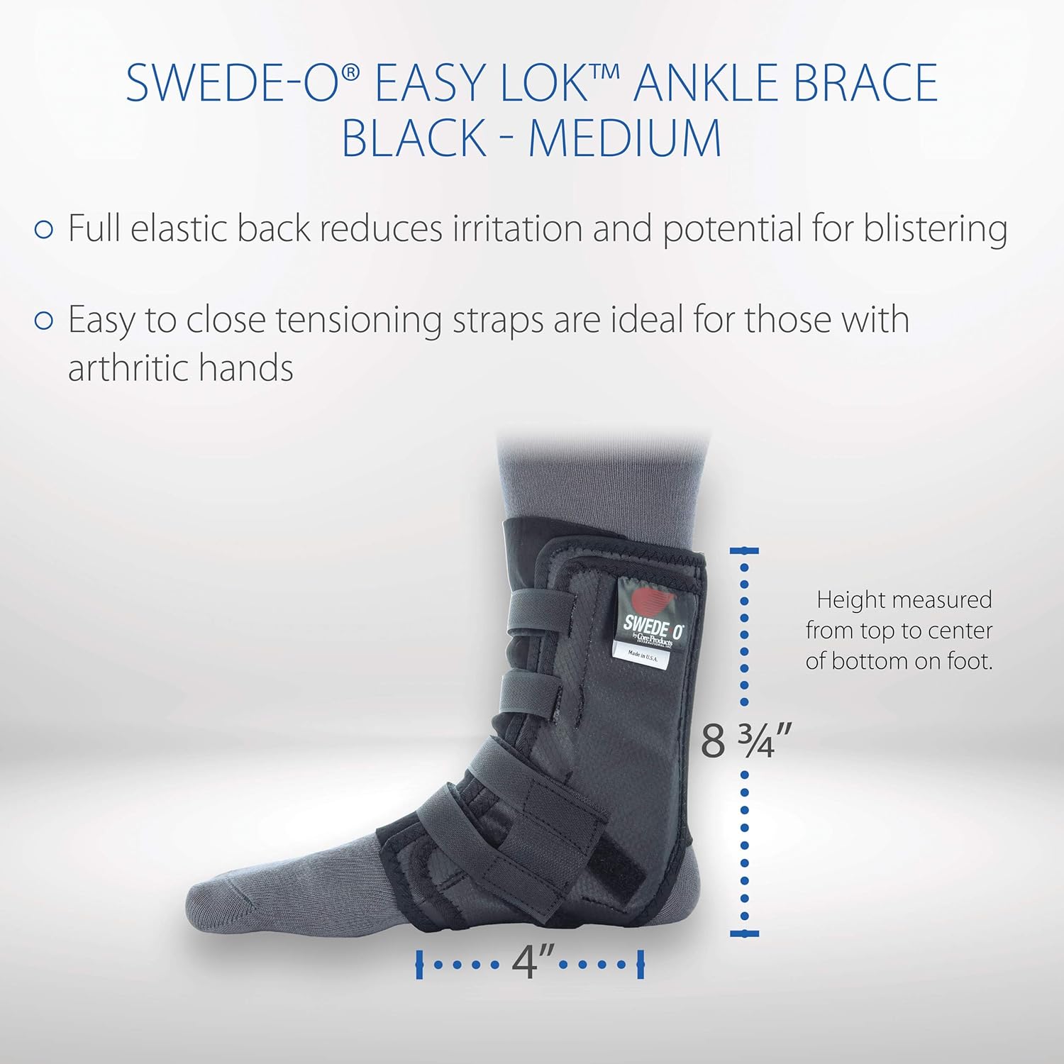 The Swede-O Easy Lok Ankle Brace is simple to apply and adjust using the two strap closure system. This brace is ideal for people with arthritic hands and those who have difficulty applying a lace-up style brace. The Easy Lok's removable side stabilizers offer additional support for weak or injured ankles. The full elastic back is comfortable against the Achilles tendon and helps reduce irritation and potential for blistering. The durable vinyl construction provides peace of mind that you're giving your ankle the best protection. This brace fits comfortably in most shoes. Made in the USA and contains no latex.