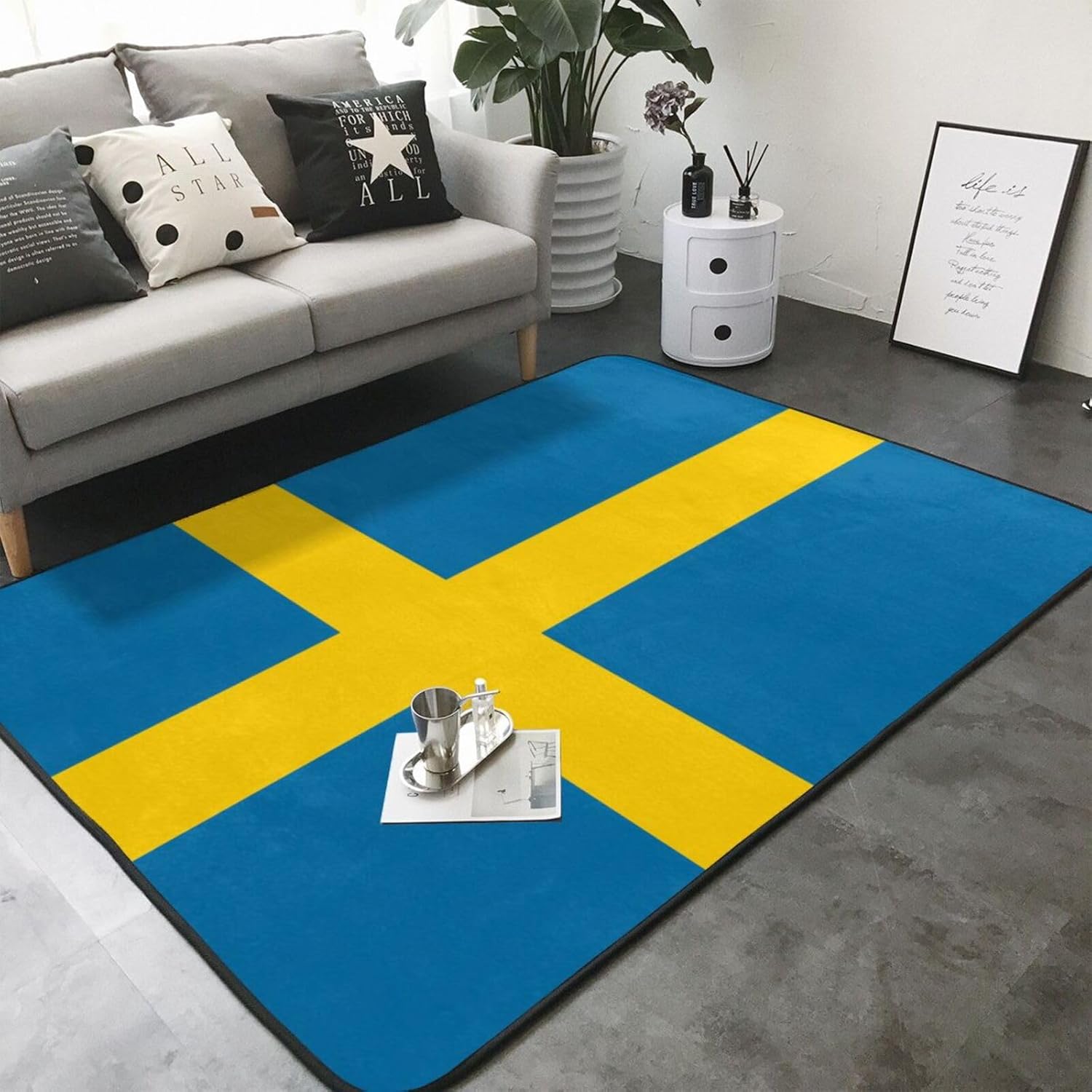 This Swedish flag printed decorative carpet is made of polyester flannel, which is delicate and soft to the touch, with tight and regular pile. It will not pill or fade after long-term use, and will always look like new. The middle layer uses high-density memory foam, which can automatically adjust according to the foot shape and pressure, providing precise massage for tired feet and relieving fatigue. The bottom is designed with non-slip plastic bottom non-woven fabric, which can firmly grip the ground even when it encounters water or on smooth surfaces, ensuring the safety of the elderly and children. It is easy to clean daily, can be machine washed or hand washed, and is wear-resistant and does not shed. Exquisite stitching technology and high-quality tailoring, with smooth edges, are suitable for a variety of scenes such as bathrooms, living rooms, and bedrooms. Non-slip, comfortable, and durable, adding a touch of intimacy and elegance to your life.