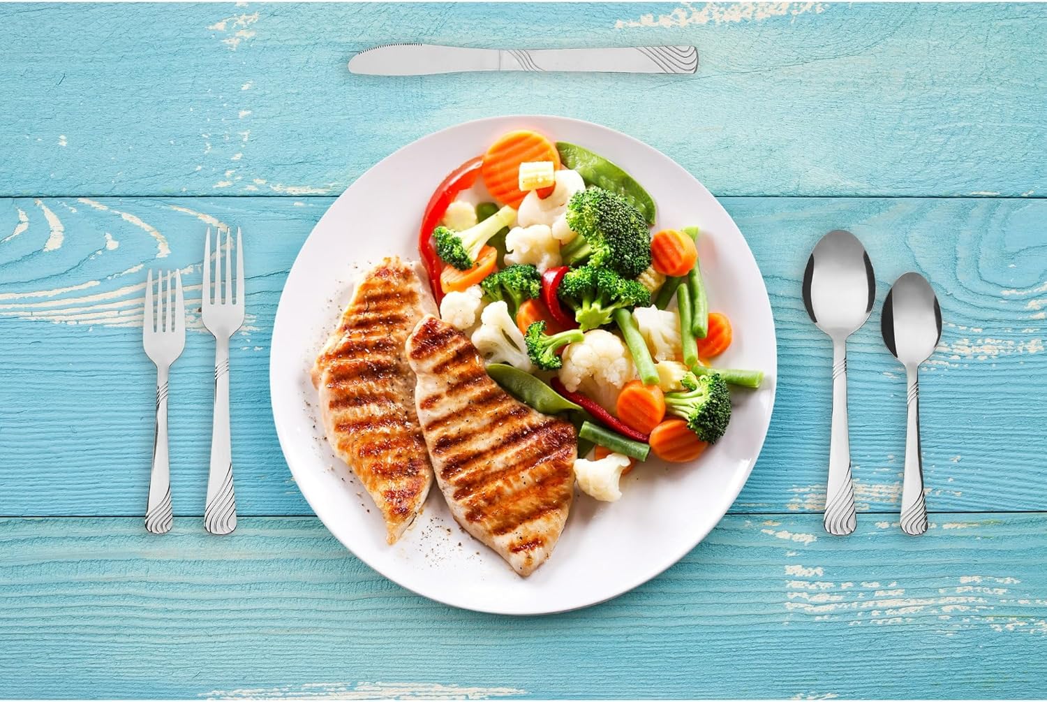 Product details Upgrade your dining table with the Swirl 49-Piece Stainless Steel Flatware Set. This casual set features a sleek swirled handle design and a brilliant silver finish that adds flair to everyday meals. It includes 8 each of dinner fork, salad fork, dinner knife, dinner spoon, and teaspoon, making it perfect for service for 8. The lightweight feel and subtly textured handles make mealtimes comfortable, while the durable stainless steel construction ensures long-lasting use. Dishwasher safe for easy cleanup. Comes with a plastic tray for organized storage. 49-piece flatware set provides service for 8 people Lightweight feel with textured handles for comfort Dishwasher safe and includes storage tray Features swirled handle design Set includes 8 each of dinner forks, salad forks, dinner spoons, and knives, and 16 teaspoons Crafted from stainless steel with silver finish 3.29lbs Great Adult Gift