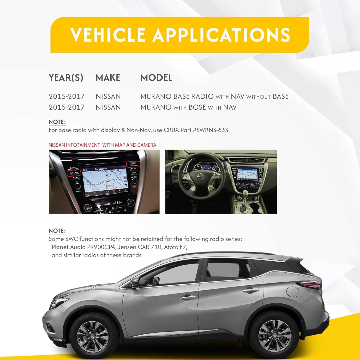 The CRUX SWRNS-63M is a Can-Bus radio replacement interface for select 2015 - 2016 Nissannn Murano vehicles equipped with factory navigation. It facilitates the integration of an after-market radio to enable the retention of certain factory features when replacing a factory-installed radio and is also pre-programmed for the retention of steering wheel controls. There are many different can bus interfaces available for Nissannn vehicles, and choosing the right one can be a bit overwhelming. Crux's SWRNS-63M makes the installation of an aftermarket radio into Nissannn vehicles easy, because it is specifically designed to work with 40 & 20 pin Nissannn Murano vehicles equipped with Nissannn Connect advanced Navigation & infotainment system. Nissannn vehicles compatible with the SWRNS-63M are select Nissannn Murano Navigation trim vehicles with & without Bose premium sound systems. The Crux SWRNS-63M also provides a wide range of features that make it a great choice for Nissannn vehicle owners. For example, it allows for the retention of factory steering wheel controls and provides for the factory backup camera to be retained even after the radio is replaced. It also allows for the factory amplifier to be retained, which is important for those who want to retain the high-quality Bose sound system that Nissannn vehicles are known for.