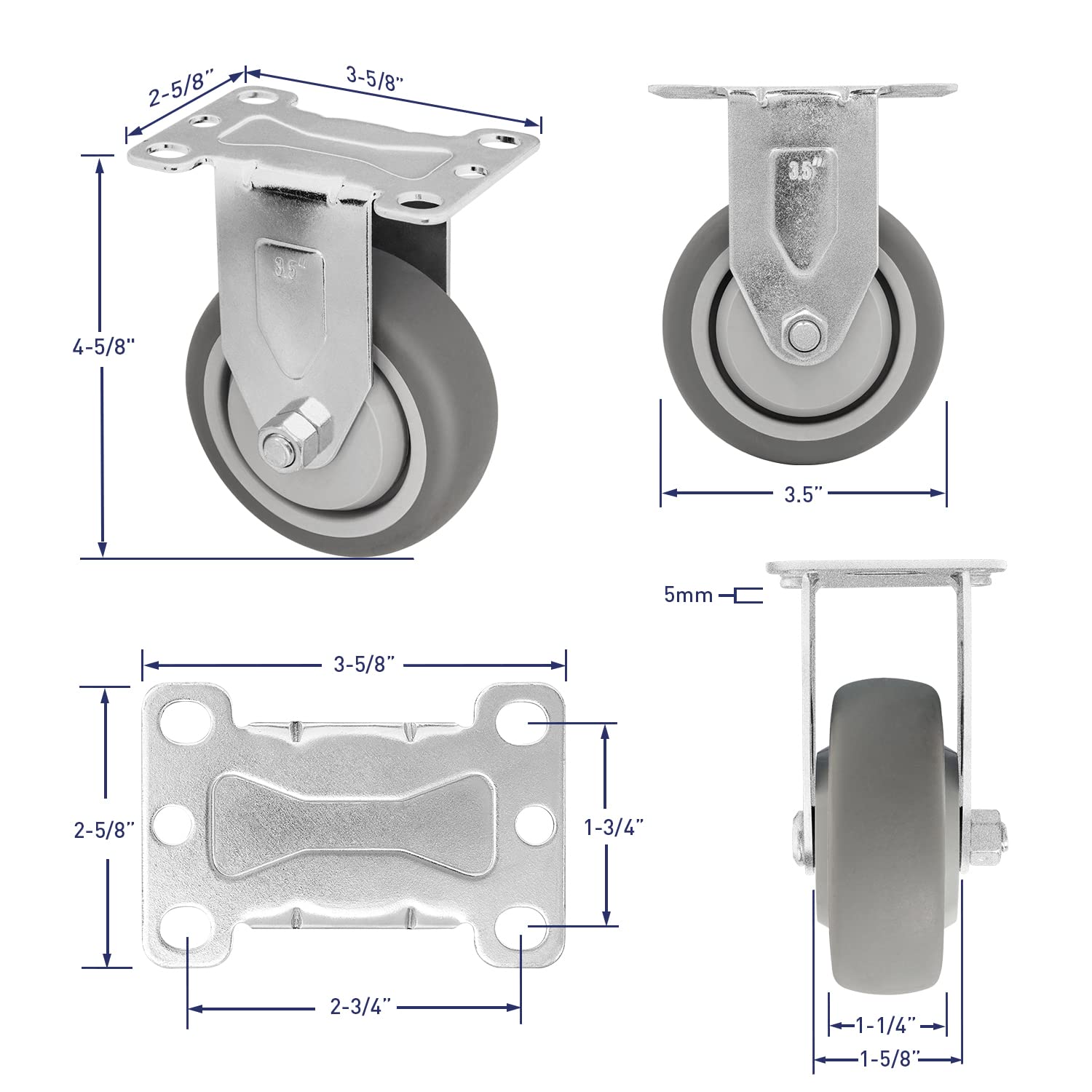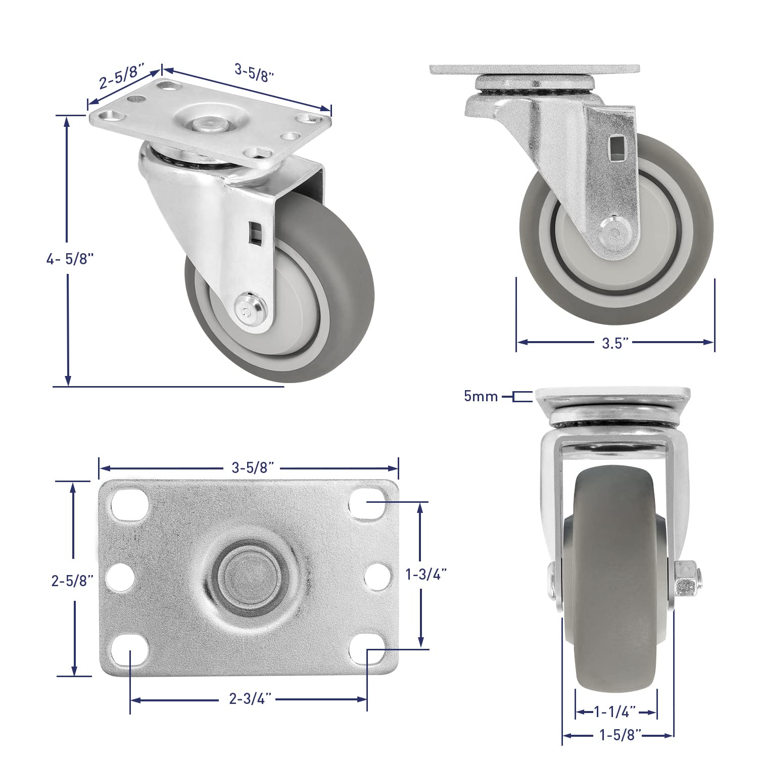 "The Top Plate Rubber Caster integrates beautiful, practical, safe and other elements is a choice you should not miss. Product Name: Rubber Caster Material: Rubber Wheel diameter: 3.5inch Width: 1.25inch Load capacity: 1300LB Color: gray Product selling point: 1. The high-quality materials have made the caster set of 4 heavy duty excellent in use and have a longer service life. 2. The Rubber caster wheels adopt a silent noise reduction design, which runs smoothly and is not easy to jam. 3. Caster wheels are widely used and can be used in various occasions. "
