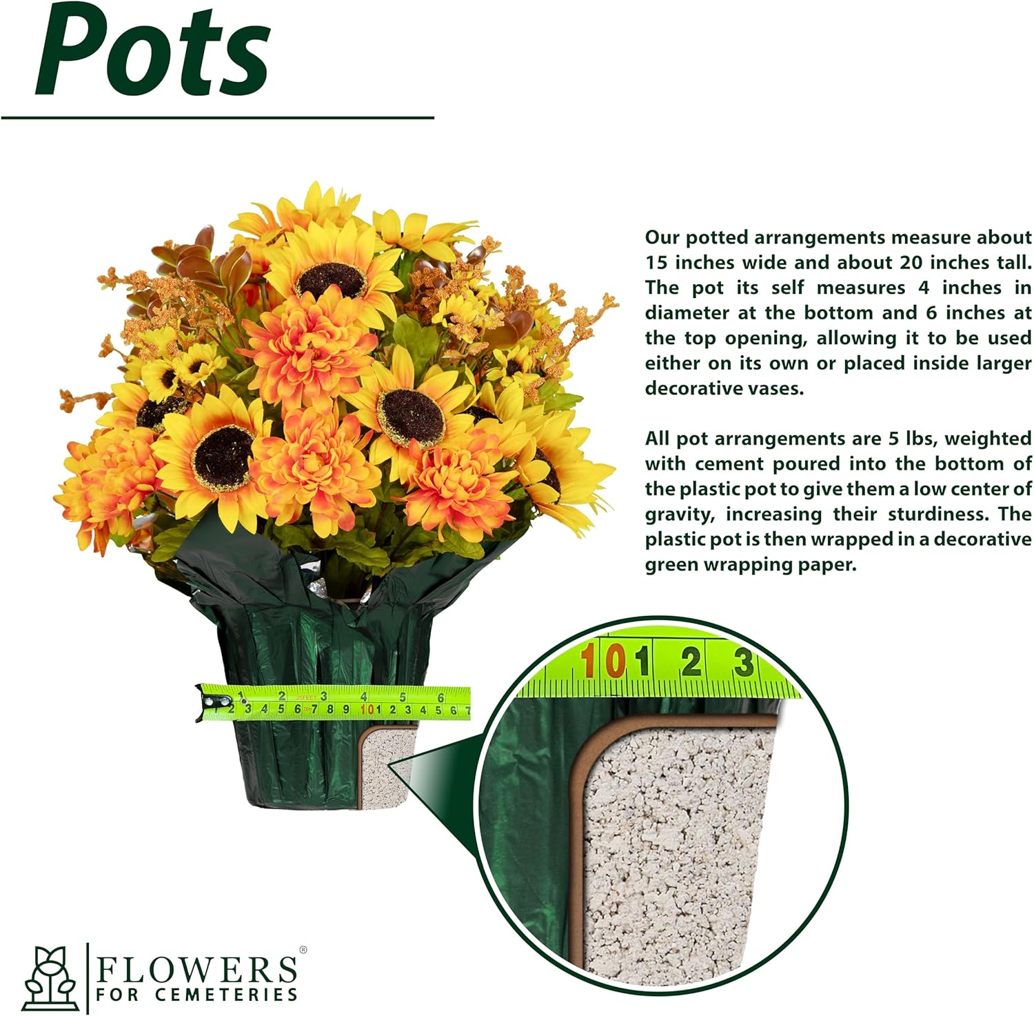2 pack of bright artificial mums with 42 stems in each pot Features & Benefits:Designed to look good all year long with no effort - Dont be fooled by this faux bouquet, no water required and no leaves to cleanup.Durable and meticulous construction - We assembled this arrangement from high quality foreign and domestic components in Marietta, GA Stain Resistant - The dyes used to color the fabric will not run out and stain anything if it gets wet. UV Resistant - We test everything in Georgia to make sure it can withstand our sunny conditions. This bouquet looked great all year, unlike real flowers that dry out, or shrivel up and don't last through the seasons Indoor or outdoor use - We designed this to withstand outdoor conditions. It will look great all year on your porch with no effort Blooming Good Guarantee - If something's wrong, let us know. We'll fix it. We've manufacturing these for about 16 years and our quality is unmatched. How big are they?The bouquet is about 18" tall and can be fluffed out to 16" in diameter. The pot base is 6" tall and 6" in diameter. The arrangement weighs about 5 pounds and is very stable. High quality long lasting mum potcan even be used on cemetery marker if you do not have a bronze vase, or if your vase is wider than 4 inches in diameter.