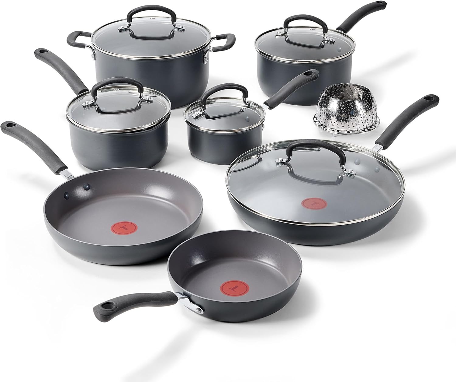 Prepare for culinary adventures with the T-fal Ultimate Hard Anodized 10 piece pots and pans cookware set. It’s hard-anodized aluminum exterior and forged design ensure durability to stand the test of time. The Titanium non-stick coating provides effortless food release, while Thermo-Spot® Technology ensures perfect preheating for consistent results every time. The anti-warping and even heat base prevents hot spots, allowing you to seal in juices and flavors. Silicone handles provide a secure grip enhancing comfort and confidence while cooking. Dishwasher and oven safe up to 400°F (lids up to 350°F), and compatible with all cooktops, excluding induction. This set is Ideal for weekday dinners, laid-back brunches, and hosting holiday gatherings, elevating your culinary experiences.