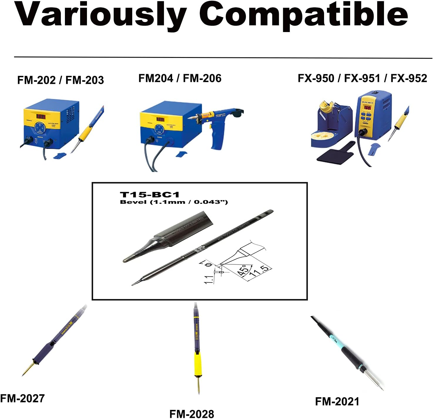Name: T15-BC1 T12-BC1 Bevel Single Flat 0.043" / 1.1mm Soldering Tips Replacement Tips Replacement Soldering Tips for FX9501 FM2028 FM2027 FM2021 FX950 FX951 FX952 FM202 FM203 FM204 FM206, These are our Own brand "ACE" but Not "HAKKO" brand. Usage:This type has a shape like a cone or column cut at a slant, which allows users to select the cut surface size depending on the workpiece. It is used for drag soldering and pre-tinning of lead wires. Warranty: We will agree to return tips and full payment refund when if you don't satisfy the tips even After Use