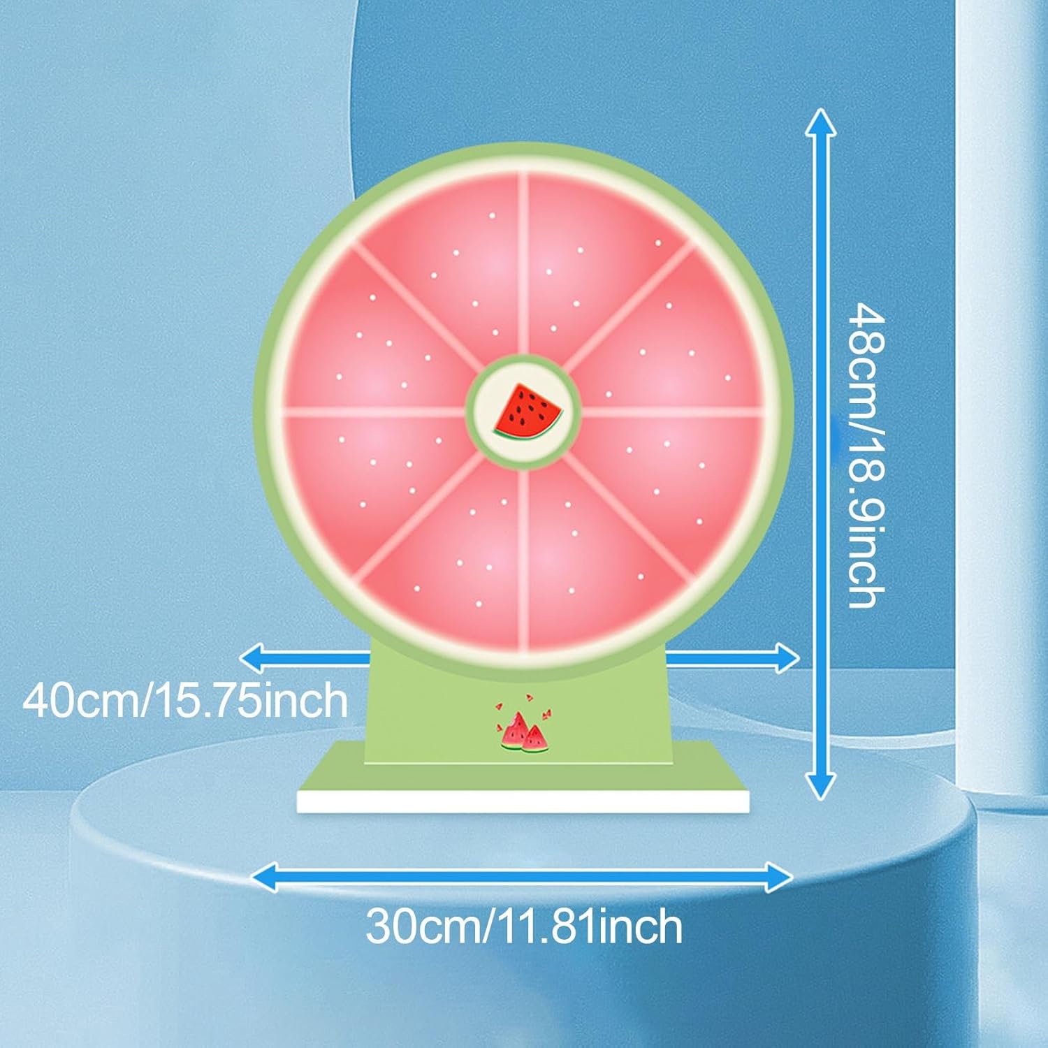 This tabletop prize turntable offers versatile functionality for various settings. Its compact design makes it suitable for tabletop use on desks, classroom tables, or party settings. The erasable surface allows for customization with the included pen, providing flexibility for different events and activities. Specification:- Material: PVCSize Chart:Overall Height: 48 cm/18.90 inchTurntable diameter: 40 cm/15.75 inchBase length: 30 cm/11.81 inchPackage Includes:1 Tabletop Prize Turntable1 PenNote:Please allow slightly errors due to manual measurement and different monitors.