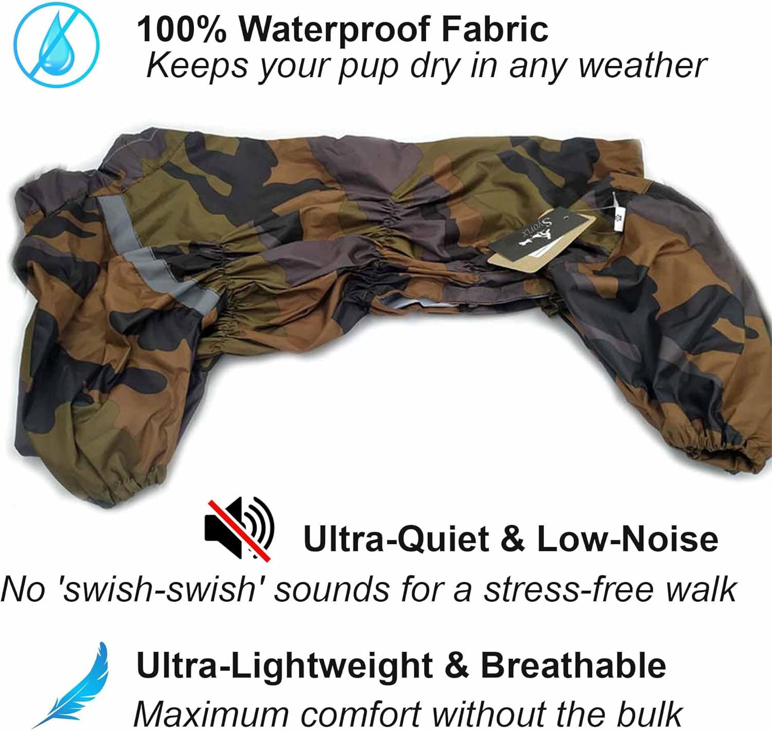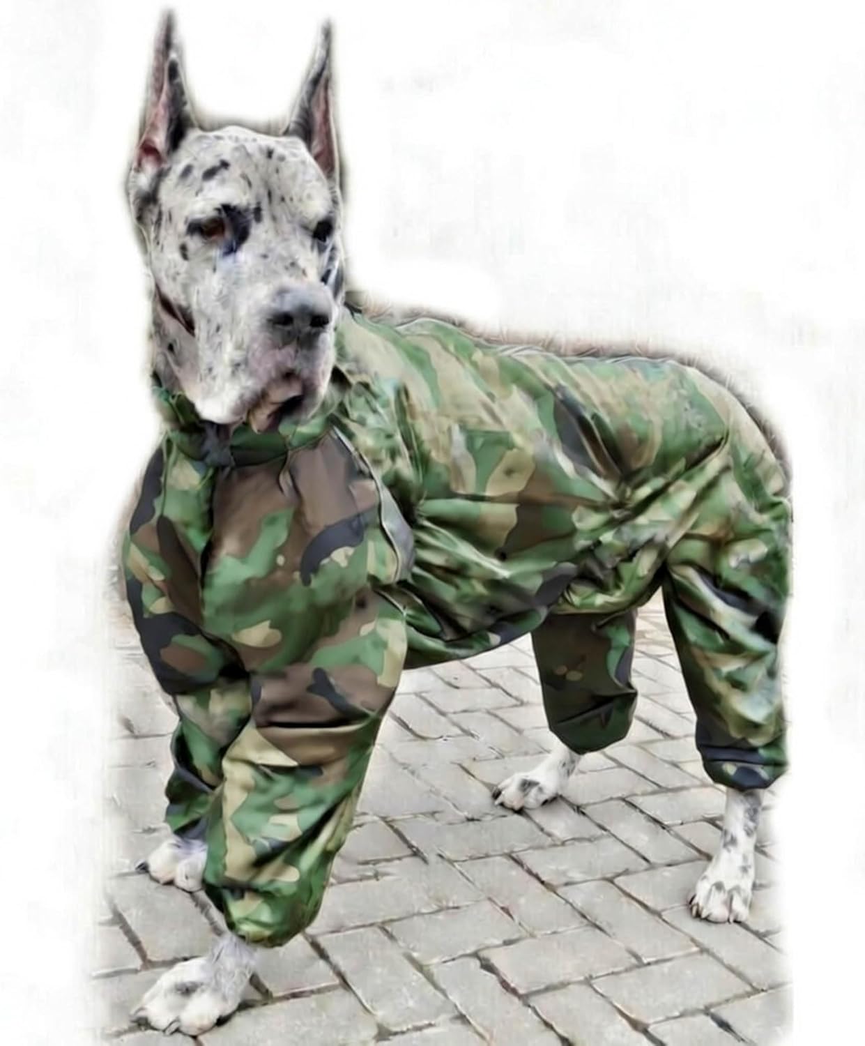 Syorix Tactical K9 Defender — Professional Rain Protection for Active Dogs. This full-body camouflage jumpsuit is designed for dogs who don't let the weather stop their mission. The Size 18 model is specifically cut for male dogs, offering an anatomical fit that provides maximum coverage without restricting natural movement. Technical Specifications for Size 18: Optimal Fit: Designed for dogs with a back length of 17.5" – 18.5" (45–47 cm) and a chest girth up to 25.5" (65 cm). Target Breeds: Ideal for medium-sized active dogs such as Bull Terriers, Basenjis, Large Beagles, and Spaniels. Premium Hardware: Equipped with a rugged #5 Tractor zipper that spans the full 18" length of the back for easy on/off. Protection: High-collar (6cm) with "Mock Neck" style prevents water from entering the neck area.
