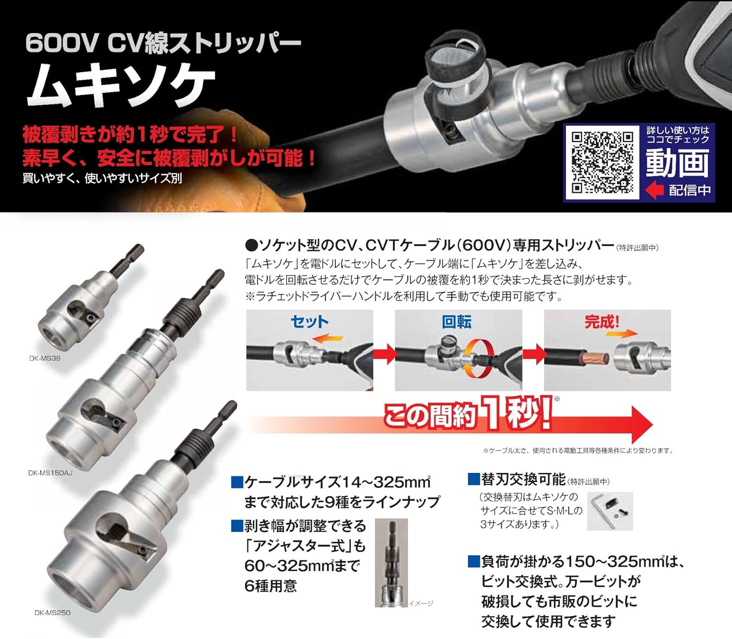 Simply set the charging driver and insert the CV cable and rotate it to remove the cover. Anyone can easily and with constant precision. Adjuster type with the width of the peeling can be adjusted and the width of the crimping terminal can be set to any number of 0.6 - 0.6 inches (0 - 15 mm). Replacement blade type (replacement blades: sold separately, Mukisoke, DK-MSBL: 1 piece, DK-MSBL3: 3 pieces) Because it is a bit replacement, even if the bit is damaged, it can be replaced with a bit. Attach to ratchet driver handle and use it by hand